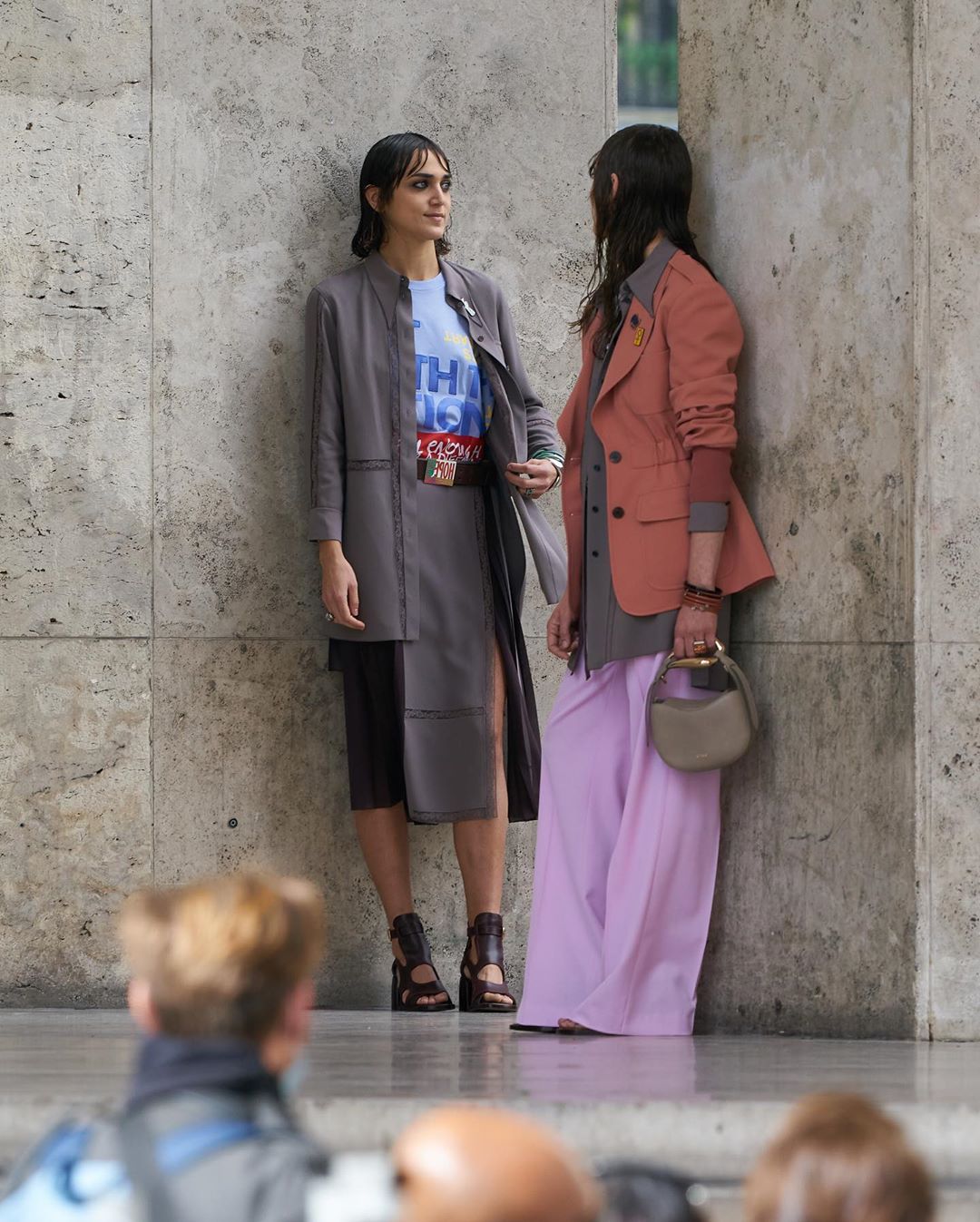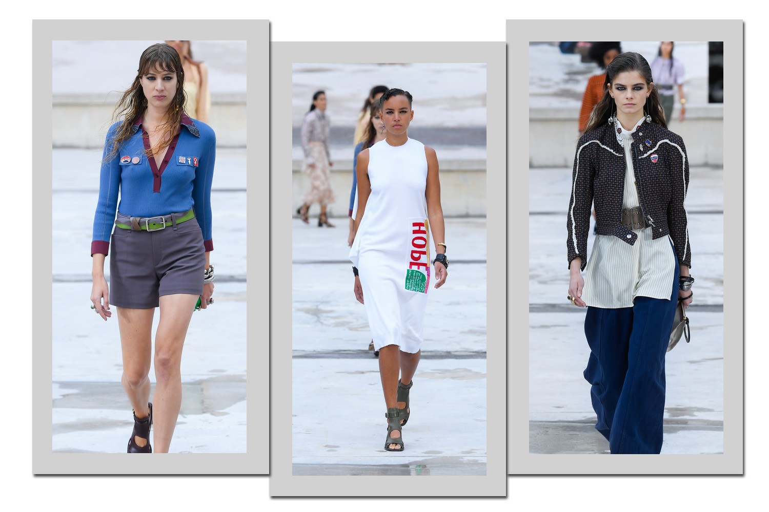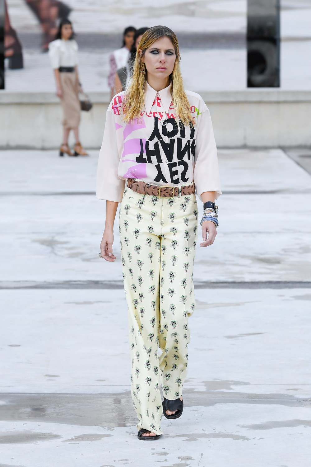 A Chloé escolheu um local aberto, a Esplanada do Palais de Tokyo, para mostrar sua coleção verão 2021 nesta semana de moda de Paris. Telas instaladas no espaço antecipavam os looks desfilados pelas modelos, entre eles um vestido branco com a palavra “Hope” escrita em vermelho. A estampa vem do acervo da artista Corina Kent, artista especializada em serigrafias vibrantes e gráficas que também era uma ativista social na década de 1960.