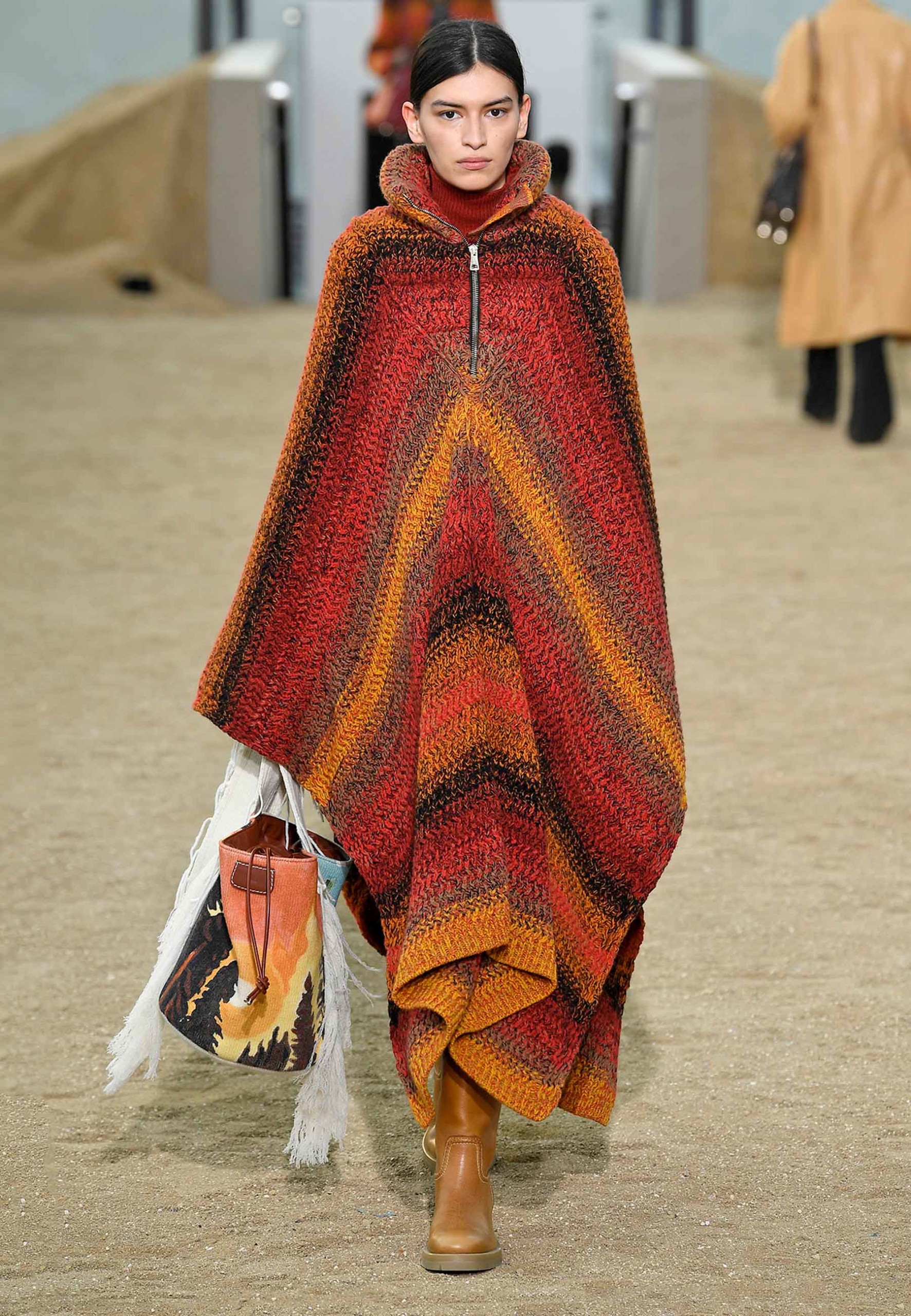 As raízes uruguaias da designer se mesclam aos códigos da casa, com casacos poderosos que seguem a silhueta de ponchos em cores terrosas. Destaque para os acessórios com pedrarias e a estruturação de suéteres criada a partir de uma grossa trama de tricô.