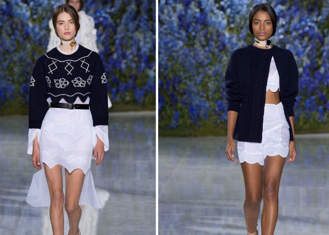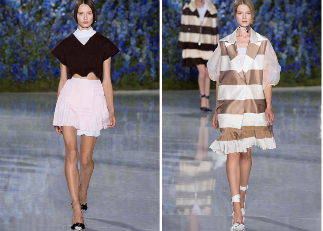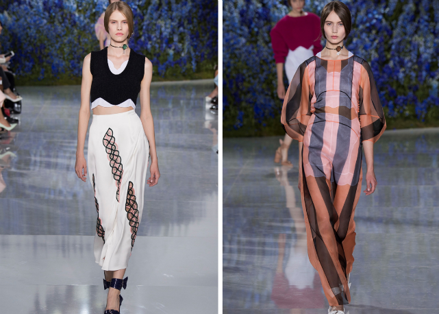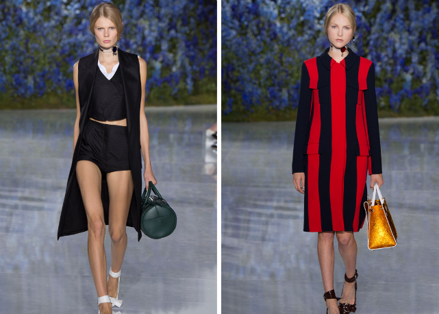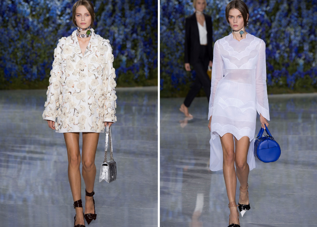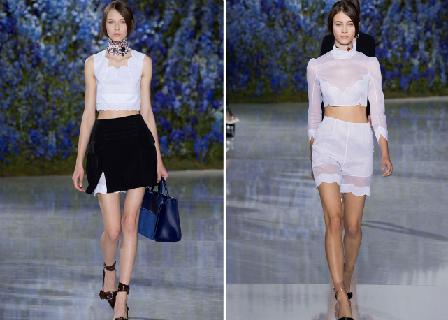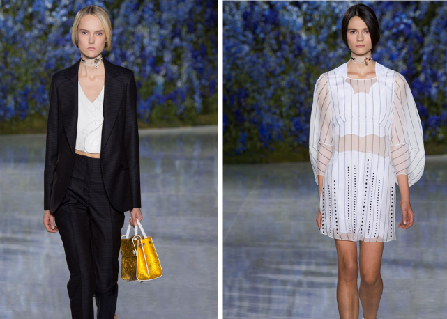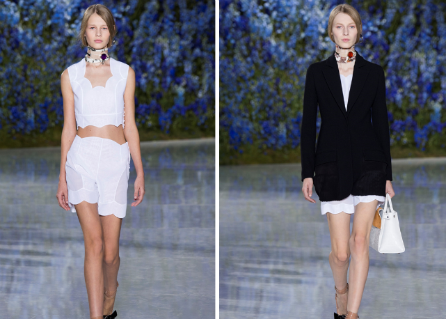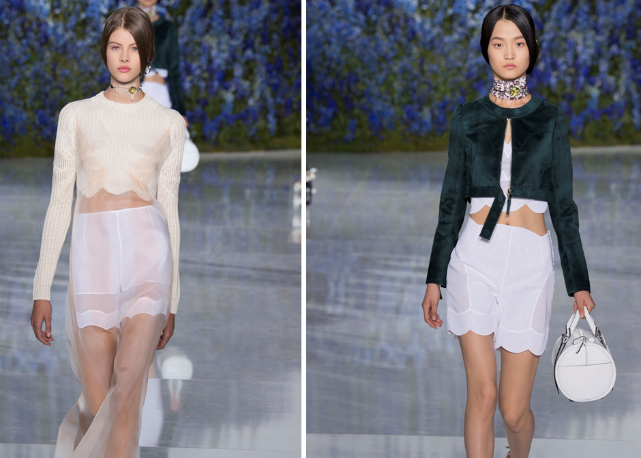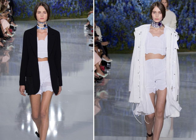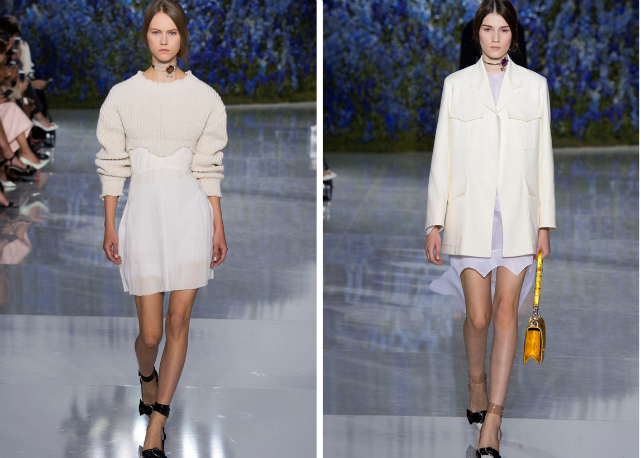 Assim, Raf sai numa missão antiexcessos, limpando sua coleção de qualquer elemento ou decoração desnecessária. O foco é na pureza de linha e técnica. O que na passarela se traduz em looks como os conjuntos de bermudas e tops de barras onduladas, como versões modernas de lingeries do século 19; os vestidos-camisola quase invisíveis de tão leves e transparentes; os chemises com plissados sob tricôs cropped e mangas volumosas; os ternos futuristas de três peças; e as parkas esportivas de cetim de seda, numa versão de luxo das referências de cultura jovem tão influentes para o estilista.