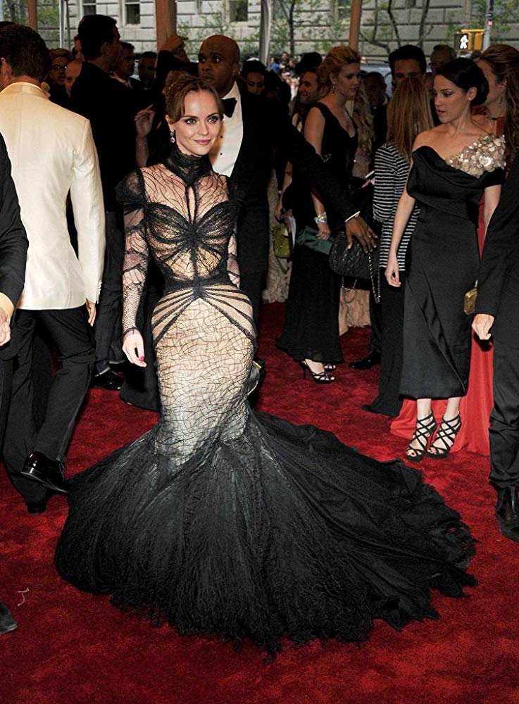 No melhor do estilo gótica suave, Christina Ricci se joga no all black sensual! O modelo marca toda sua silhueta e, de forma dramática, a cauda enriquece o visual.