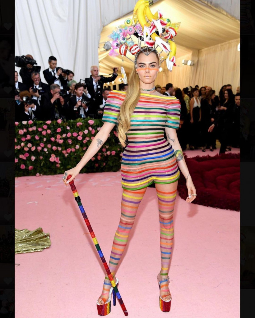 A modelo Cara Delevingne compartilhou com o público sua vida pessoal logo no começo da carreira, em 2013 contou á imprensa que é lésbica e nunca enfraqueceu nos holofotes com as cores do arco-íris, se inspirando nas cores da bandeira mesmo longe do mês do orgulho como em seu visual para o Met Gala de 2019.