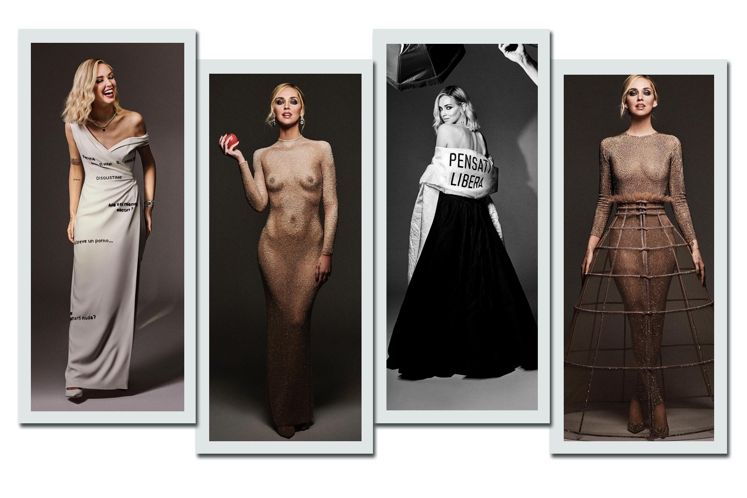 Entre as peças criadas, a empresária usou o “vestido do ódio” (modelo branco estampado com frases de ódio comentadas por haters nos perfis da influenciadora), o “vestido sem vergonha (em que o bordado representava a forma de um corpo feminino nu), o “vestido manifesto” (peça em seda preta com uma estola bordada com a frase “Pensati Libera”, “pense livremente” em tradução livre, estampada) e o “vestido jaula” (em que a saia representa o desejo de quebrar as imposições do patriarcado).