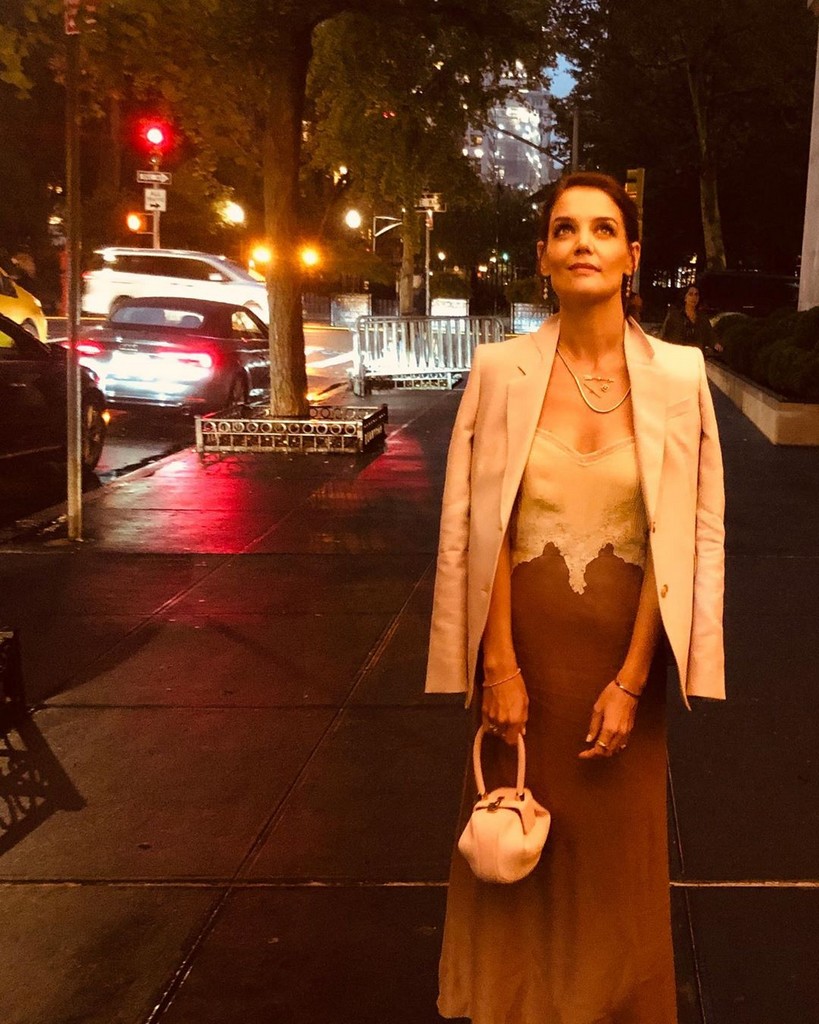 Katie Holmes é fã de looks monocromáticos, principalmente visuais totalmente pretos, azuis ou rosas. É comum ver a atriz usando um terninho com uma camiseta do mesmo tom – ou vestidos e sapatos combinando.