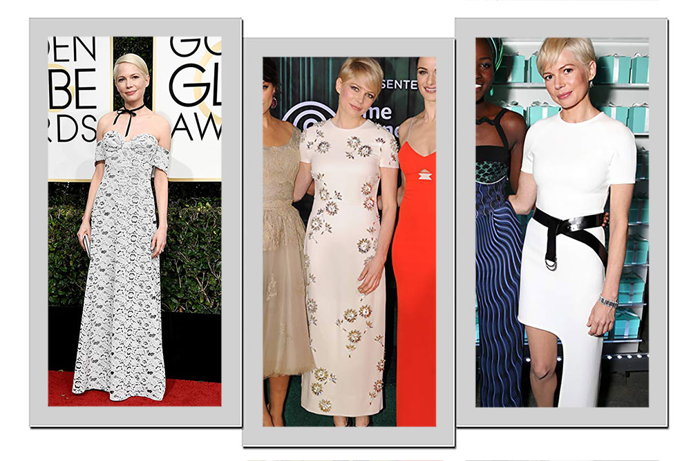 E Michelle Williams tem uma cor preferida: prata. Sempre que usa o tom metalizado, ele vem acompanhado de detalhes ricos em texturas. Assim, a atriz sai do comum e conquista as fashionistas.