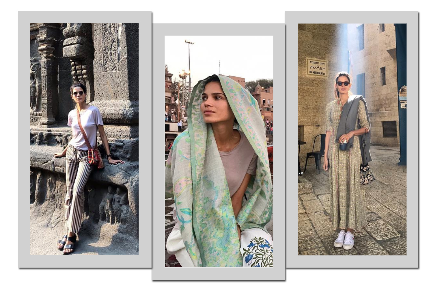 3. Quando viaja, Raica aposta no confortável, mas sem perder a pose fashionista. A dica é escolher peças com informação de moda. Por exemplo, a calça listrada preta é um must do street style. O lenço na cabeça é sinônimo de finesse – e respeito a algumas culturas. O tênis e saia é a melhor combinação para manter a elegância no casual.