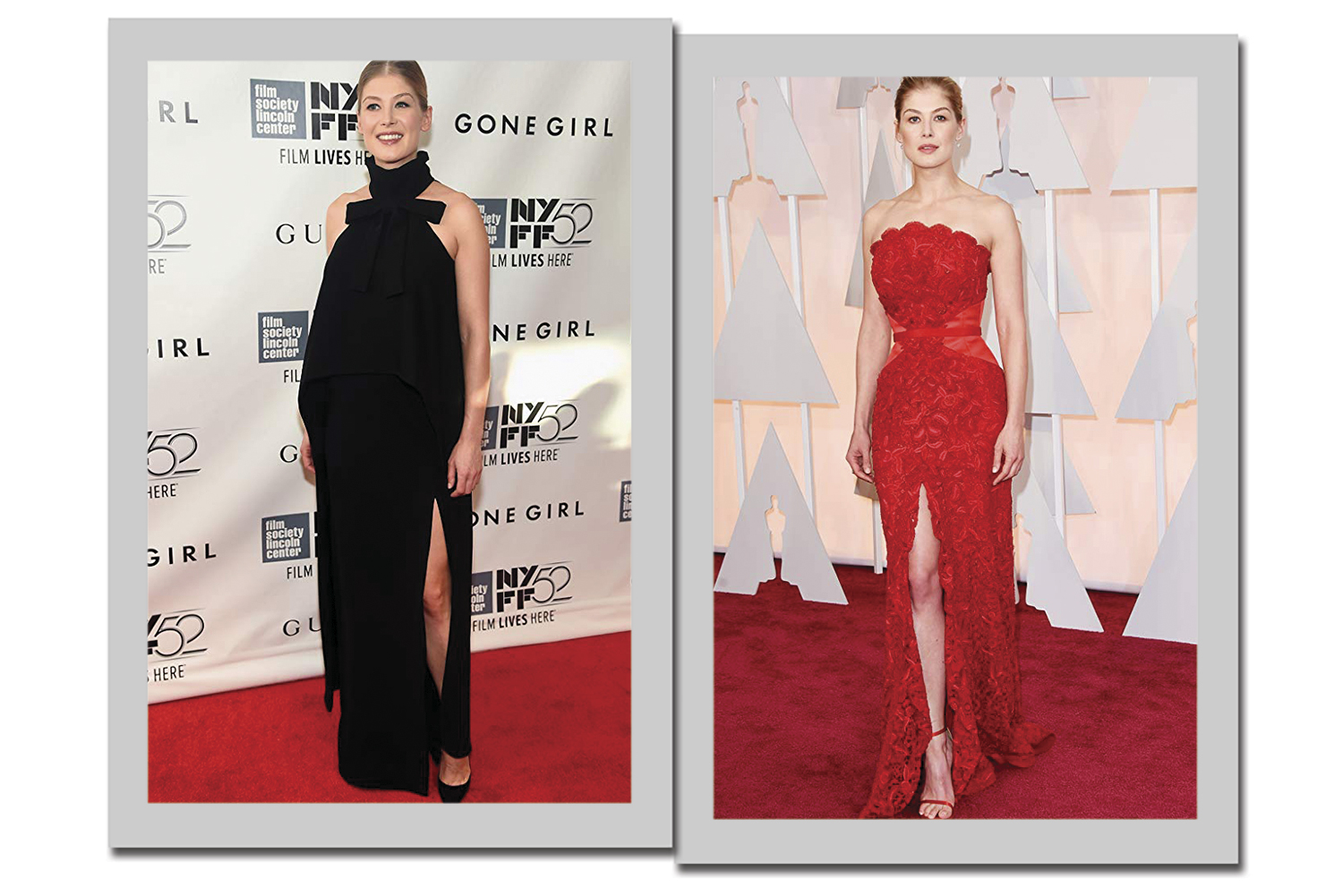 1. A fenda é o melhor recorte para apostar. Ela alonga o visual e adiciona sensualidade ao look. E ela não precisa ser profunda ou exagerada para isso. Rosamund Pike mostra como um pequeno recorte pode ser suficiente para enriquecer toda produção.