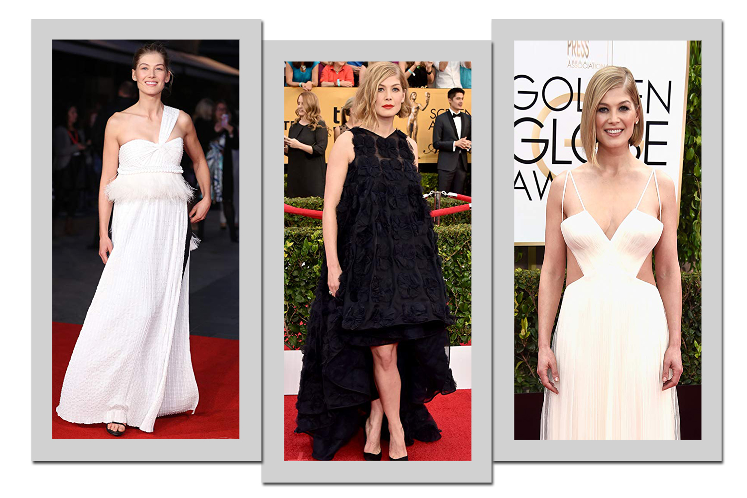 5. Os clássico looks all black e all white são usados com frequência, por todos. E é necessário apostar em algum detalhe para se diferenciar dos outros. E Rosamund Pike sabe o que fazer! A atriz escolhe modelos com modelagens trabalhadas, para sair do mesmo.