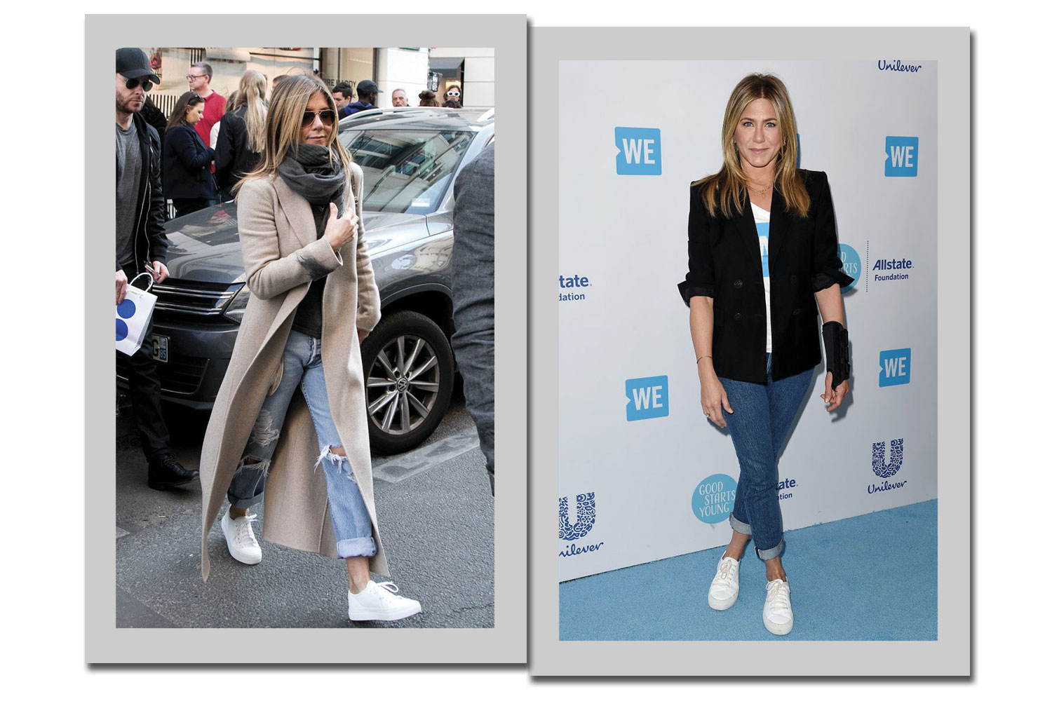 Para ir ao trabalho, pegar um avião ou simplesmente correr pelas ruas da cidade, nada melhor do que conforto, mas sem perder a elegância. O truque de Jennifer Aniston não poderia ser mais acessível: calça jeans + camisa usada por dentro da calça. Use com bolsa que tenha alça de corrente.