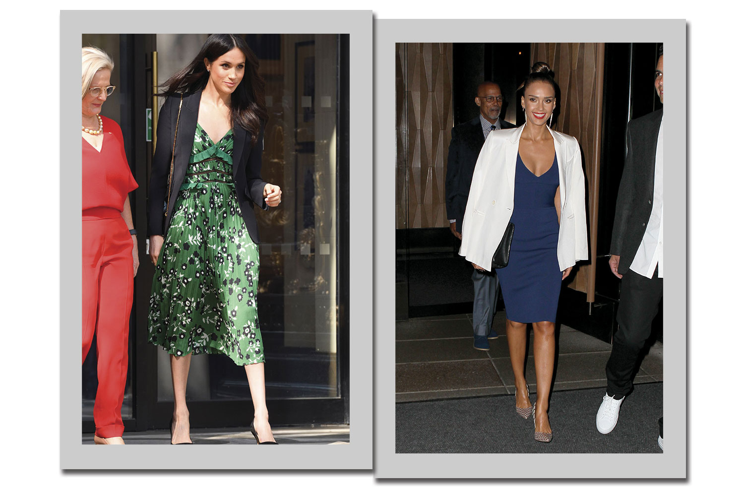 Um truque de styling que deixa qualquer vestido mais elengante é usá-lo com um blazer. Meghan Markle adora essa combinação, assim como Jessica Alba.