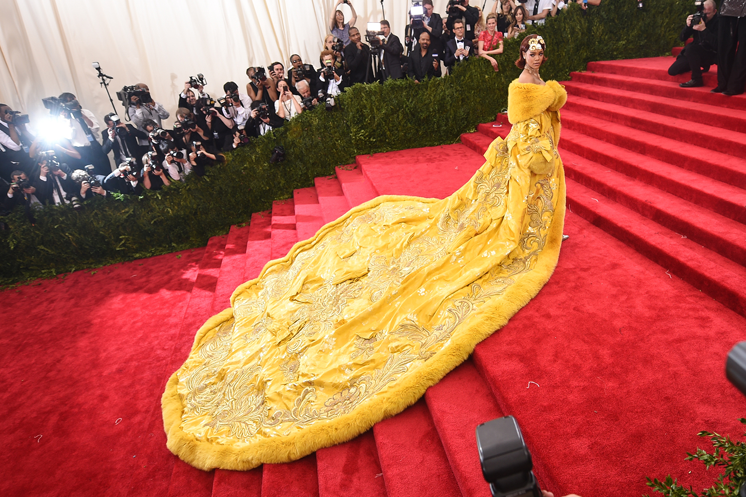 Ninguém levou tal façanha tão ao extremo quanto Rihanna. Em 2015, ela desfilou o famoso vestido amarelo da estilista Guo Pei que tinha 4,8 metros de comprimento. Para se posicionar para o clique do red carpet, a pop star precisou da ajuda de quatro seguranças.