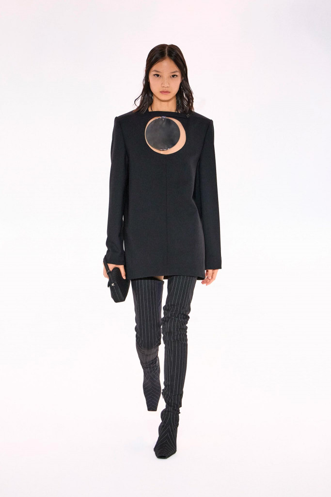 Um dos vestidos de coluna preto, a letra “o” esculpida e substituída por um pingente gigante espelhado – um leitmotiv que reaparecia em vestidos monocromáticos de linha A, casacos sob medida, tops curtos e jaquetas de couro que apresentavam decotes ou recortes.