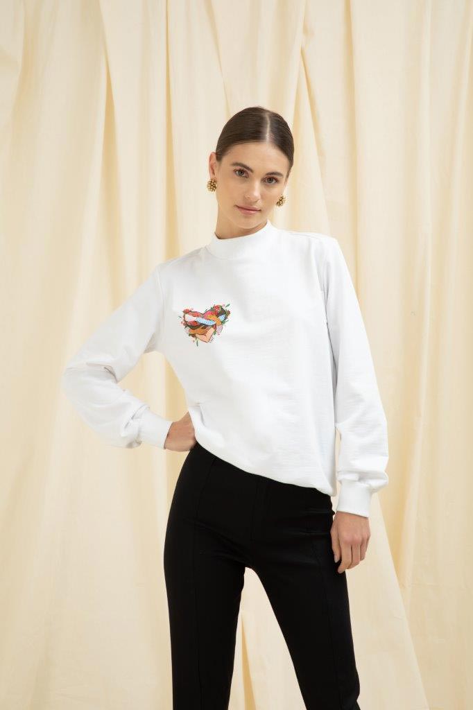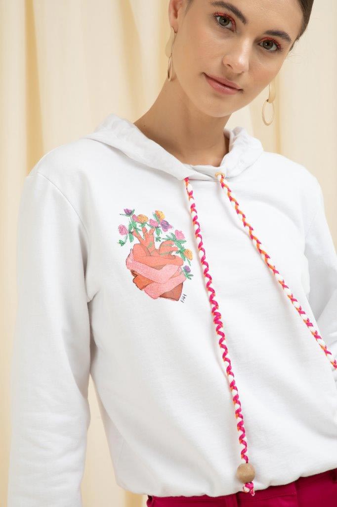 A linha tem dois modelos de blusas de moletom, ambos na cor branca e com uma ilustração em formato de coração – humano e desenho, com braços realizando a ação do abraço, criados pela ilustradora Mônica Ruf.