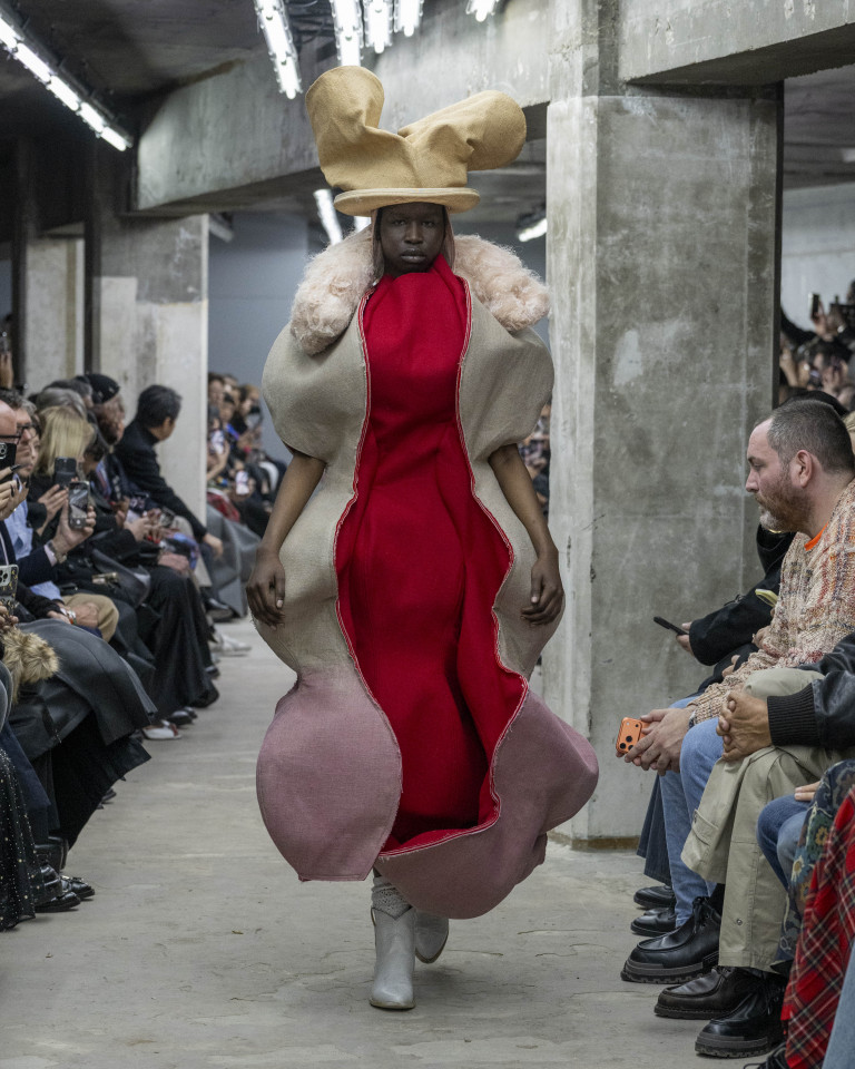 Os looks vinham cobertos por perucas em forma de travesseiros, cones acolchoados e feixes translúcidos de tecido, compondo um desfile que parecia questionar onde termina a roupa e começa a ideia.
