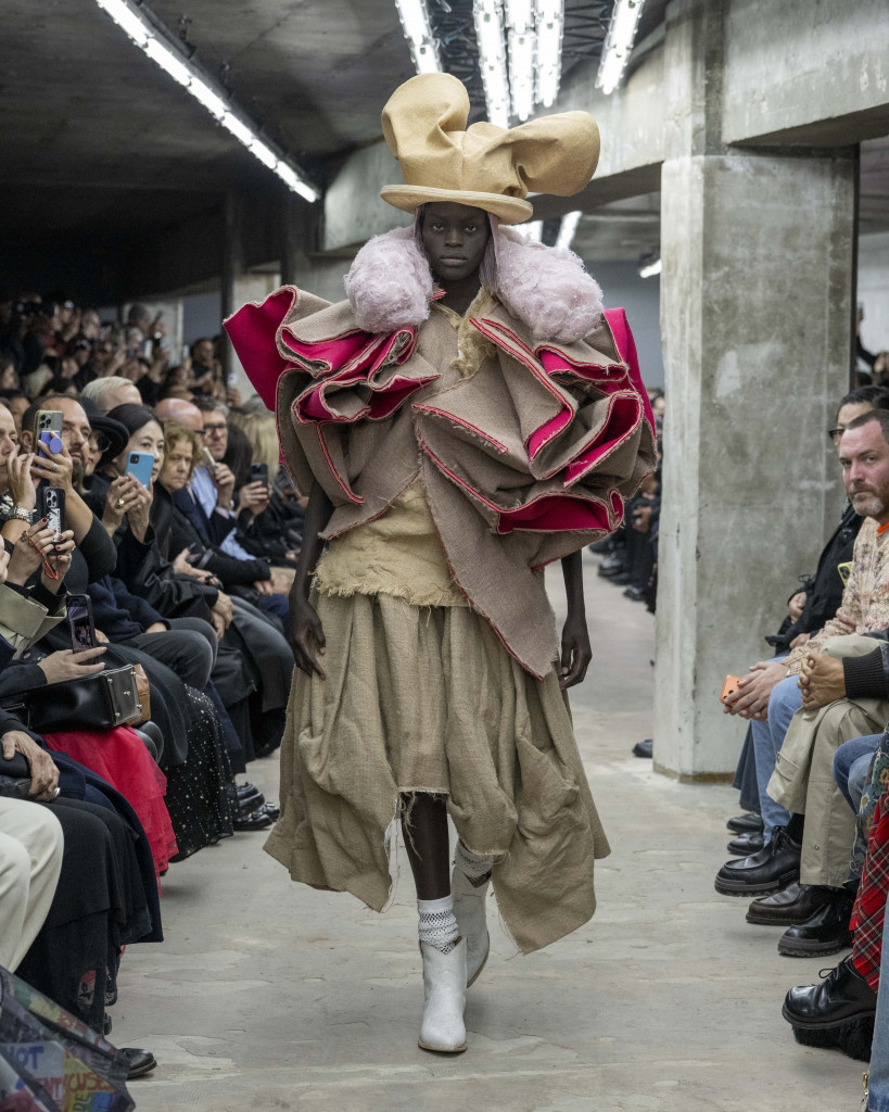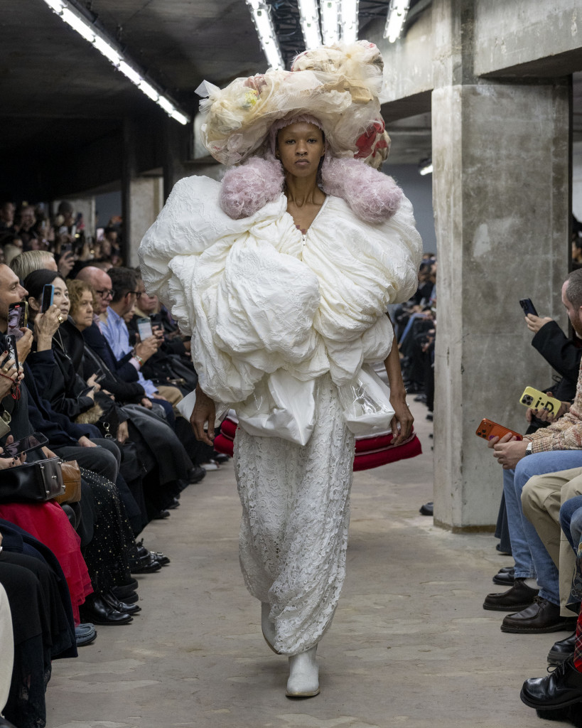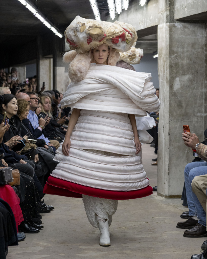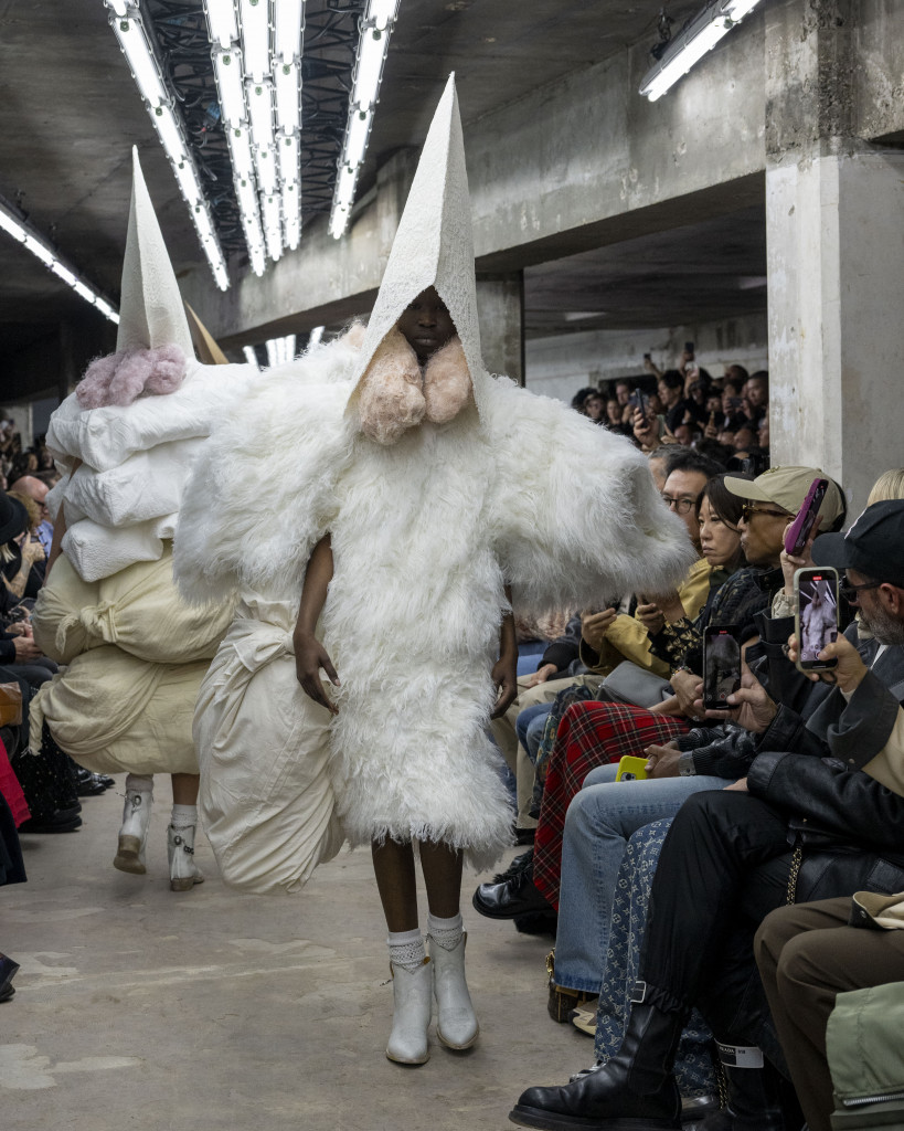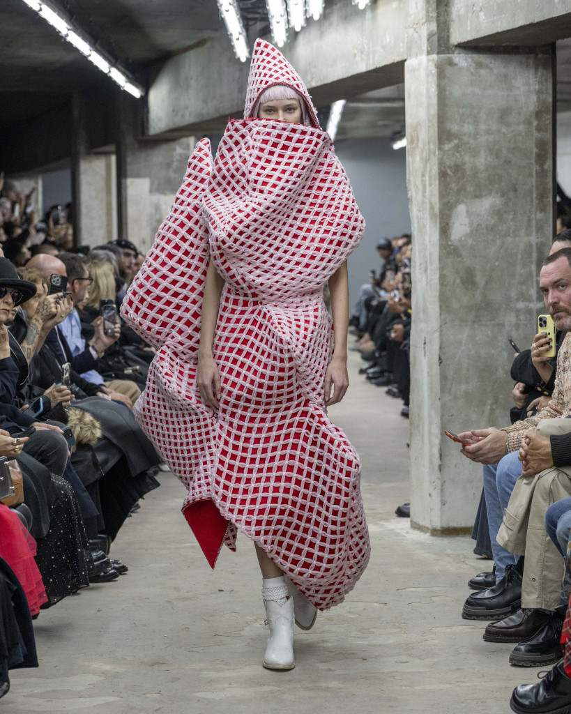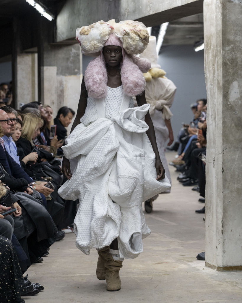 Os looks vinham cobertos por perucas em forma de travesseiros, cones acolchoados e feixes translúcidos de tecido, compondo um desfile que parecia questionar onde termina a roupa e começa a ideia.