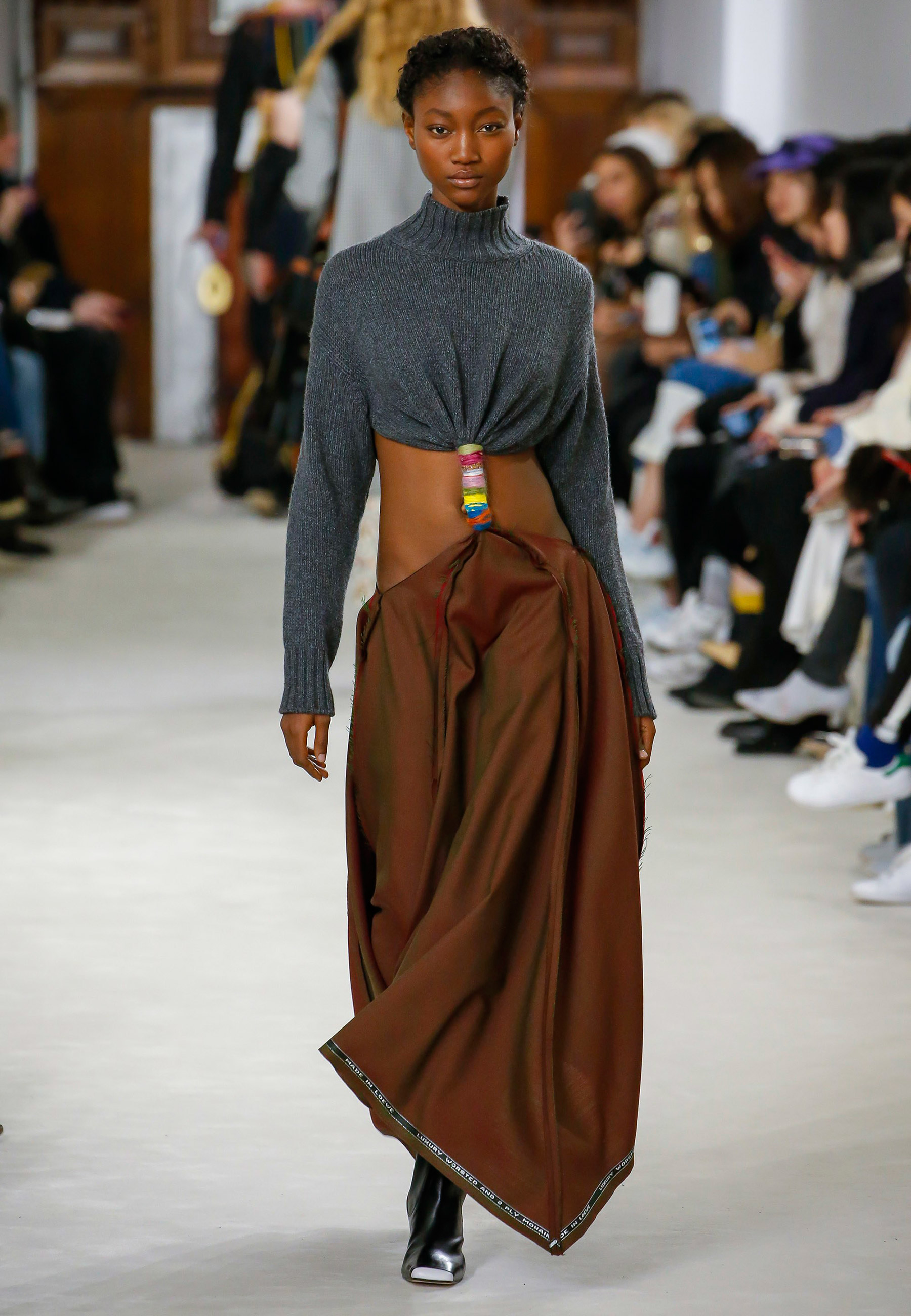 Na foto acima, o look da Loewe desfilado em 2018 é a prova da elegância da saia. E fica a dica: combinar o tricô de lã ou cashmere com a saia longa é o ápice da elegância. Principalmente quando a saia é cortada de maneira assimétrica – assim a modelagem proporciona ainda mais movimento ao visual.