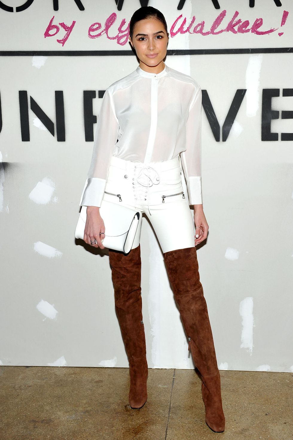 Ou faça como Olivia Culpo, e contraste o look all white com botas acima do joelho.