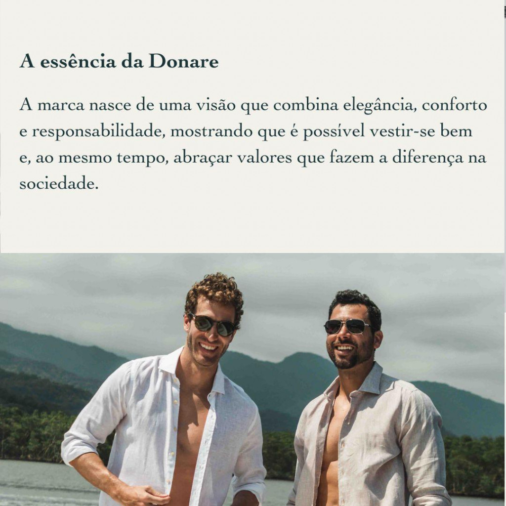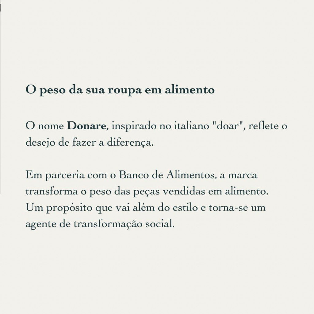 Com a missão de transformar os melhores tecidos do mundo em peças básicas, confortáveis e fáceis de combinar, a Donare abraça o sofisticado em cada peça. Acreditando no poder das pequenas transformações e no impacto significativo que elas podem ter, cada peça da Donare carrega uma promessa: a de vestir quem muda o mundo. Comprometendo-se não só com a qualidade e estilo, mas também com a responsabilidade social. Em uma parceria com a ONG Banco de Alimentos, o peso de cada roupa vendida se converte em alimento para quem precisa. Donare. Do italiano, “doar”. Essa é a essência da marca.