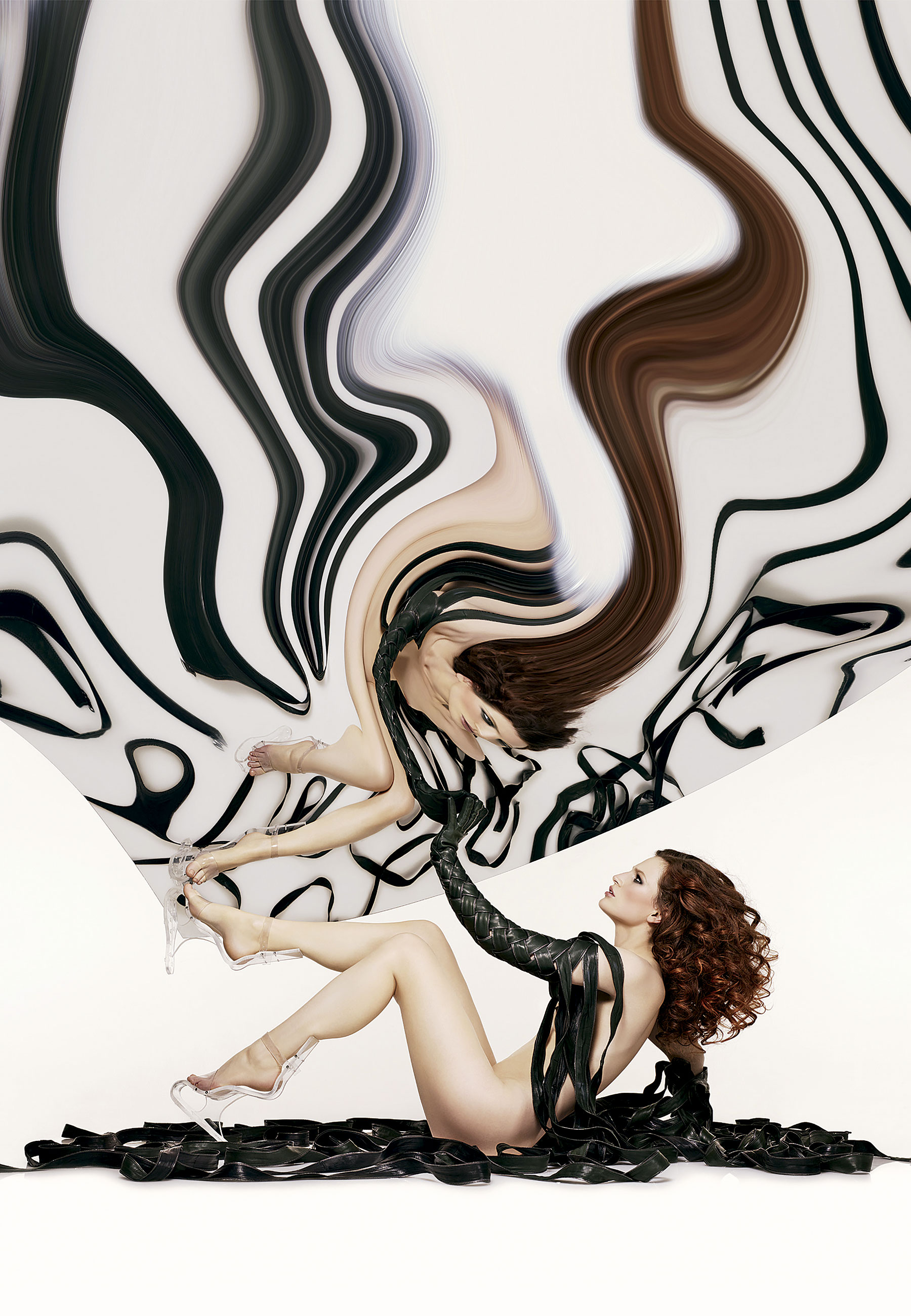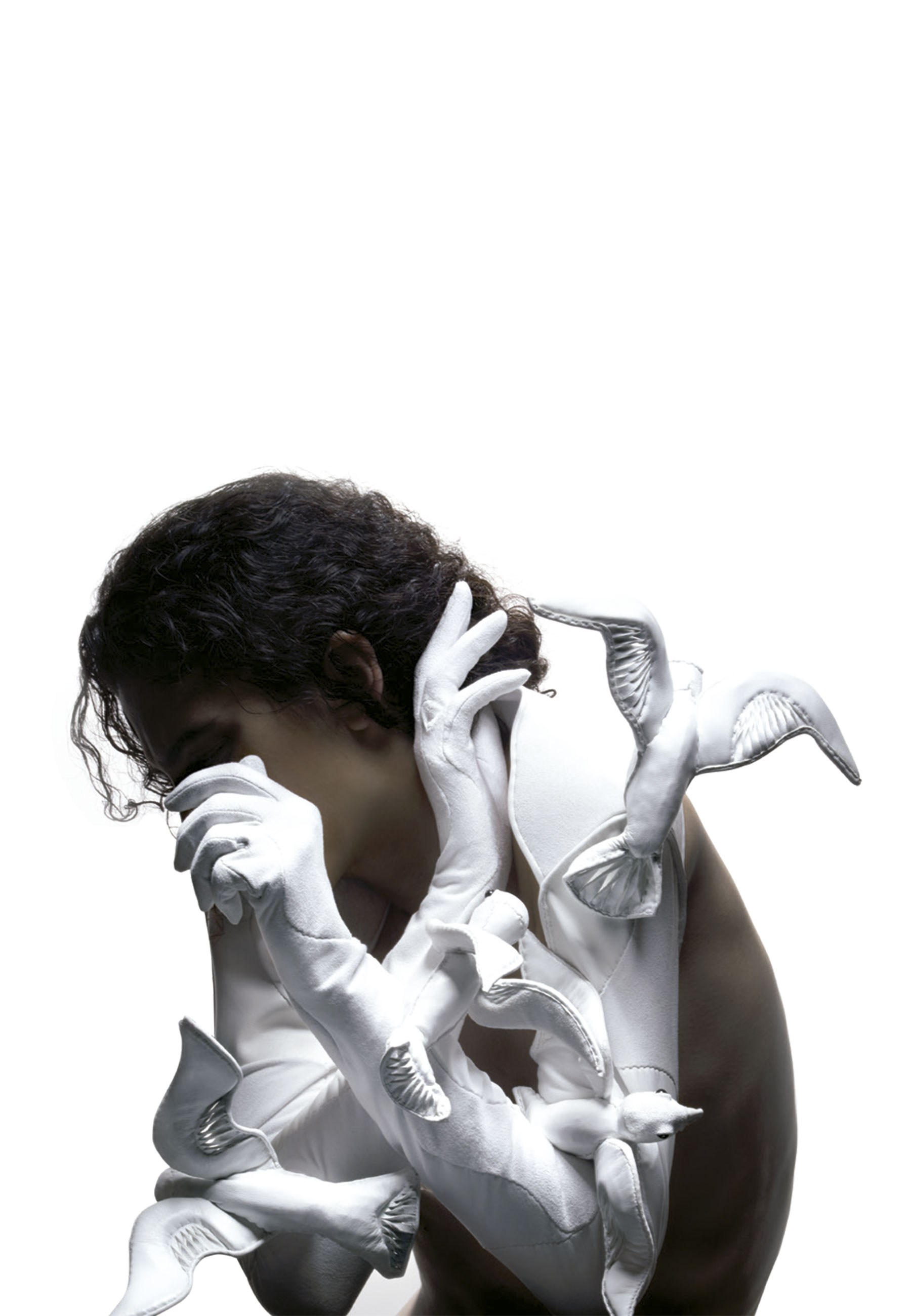 Os últimos exemplares desse trabalho minucioso são a Embrace Space, modelo monumental, com quatro metros de couro, lembrando uma serpente. Ou seria uma vinha? A “Shades of Honesty” brinca com tule de seda cinza emoldurado com couro prateado, em modelo inspirado na foto “Money Plant”, da fotógrafa Imogen Cunningham.