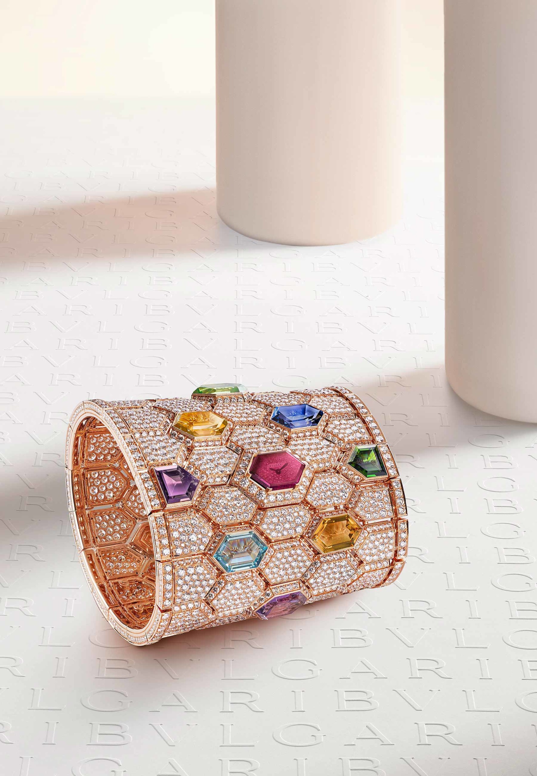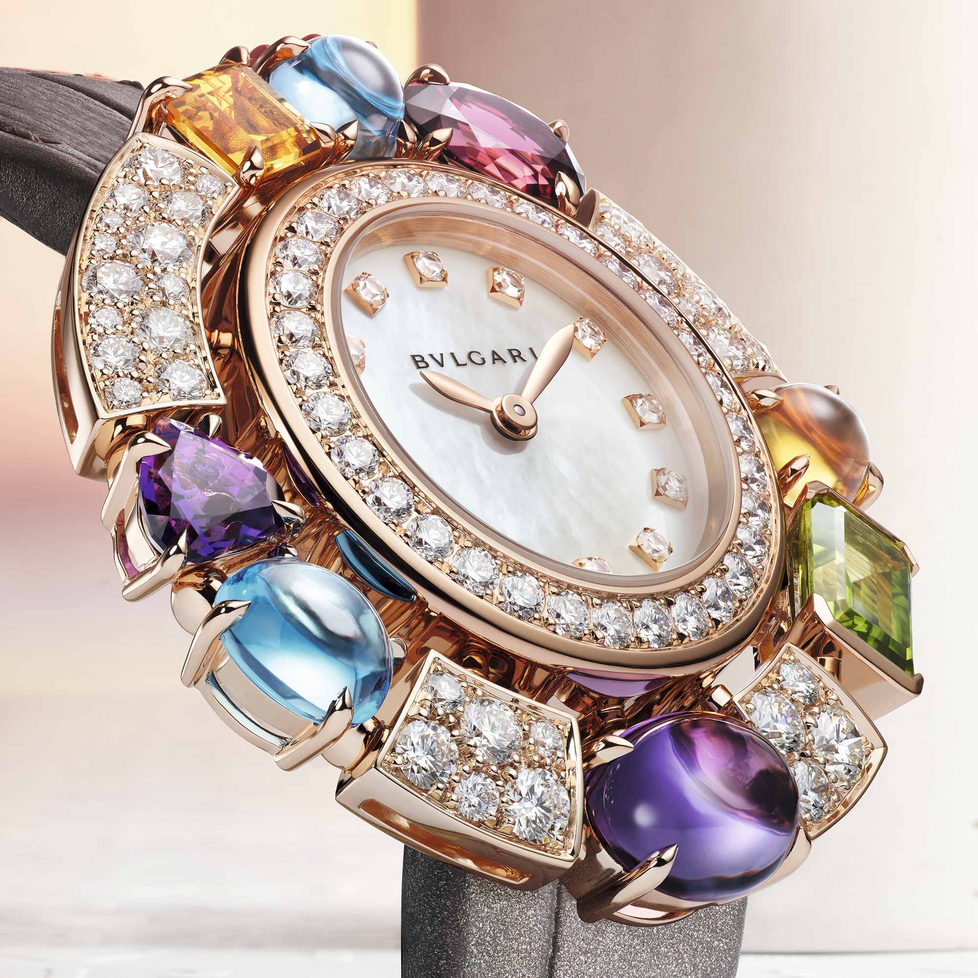 São nove gemas diferentes: pares de ametistas e citrinas facetadas hexagonais, água-marinha, rubelita, turmalina cromada, tanzanita e um peridoto com peso total de mais de 50 quilates, acompanhados de cerca de 4 mil diamantes com cravação nevada. Apenas a incrustação das gemas levou mais de 470 horas de trabalho meticuloso. Por fim, as últimas versões de Divissima e Astrale Cocktail Watches atualizam dois designs clássicos da Bvlgari. Beleza e tecnologia, uma tradição da label italiana.
