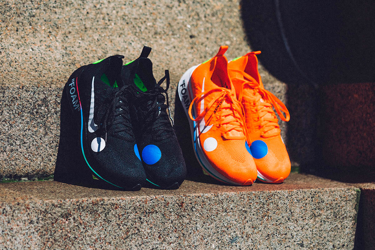 A coleção de Abloh também tem seus próprios tênis, em preto com detalhe em azul e branco; e laranja, também com detalhes em azul e branco. Há também roupas esportivas que misturam os logos da Nike e da Off-White.