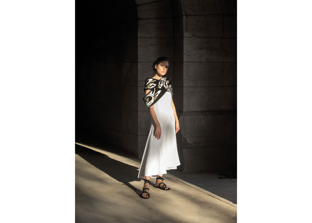 Jaqueta de jacquard de algodão, saia de crepe de seda e underskirt plissada – foto: Vicente de Paulo