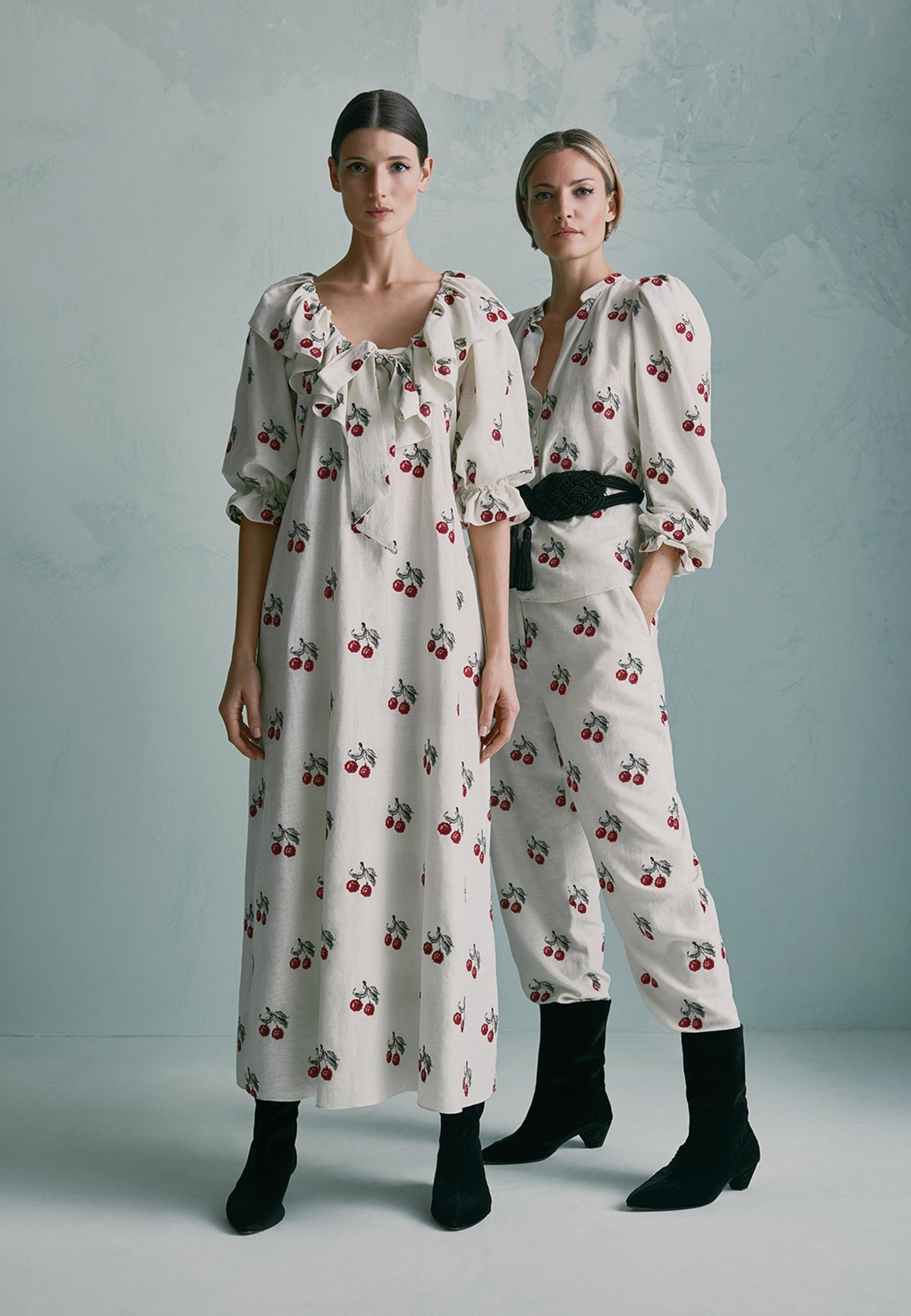 A influência oriental também aparece nos vestidos de babados com as simbólicas cerejas de ponto-cruz, nos botões alamares aplicados em várias peças, bem como nos vestidos de floral com bordados que resgatam a silhueta do tradicional quimono japonês.
