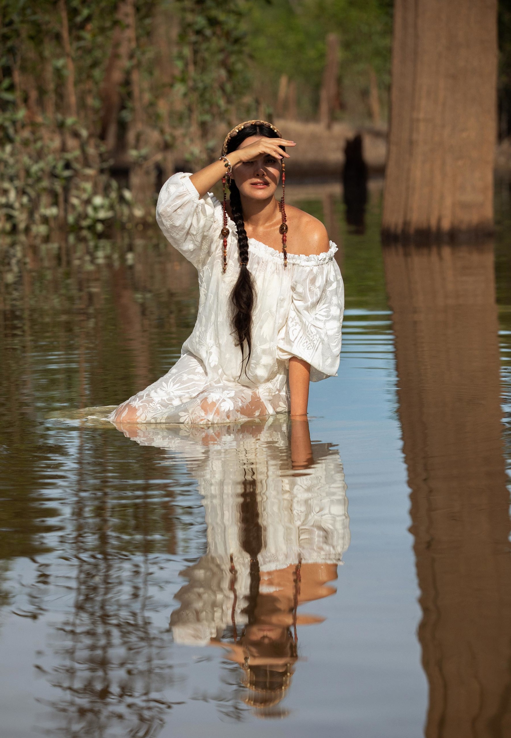 Junto a estilista Cris Barros, a atriz Débora Nascimento, a cantora Roberta Sá e a artista multidisciplinar e professora de ioga Juliana Luna viajaram para a Amazônia para conhecer de perto as artesãs e fotografarem a campanha.