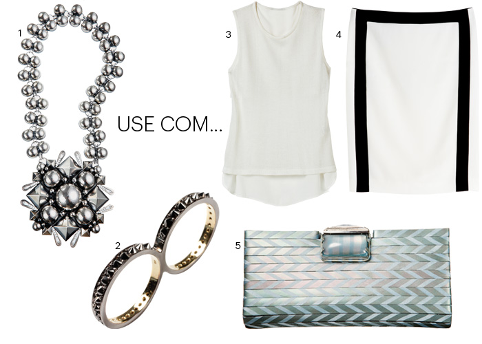 (1) Colar (R$ 14.320), Bottega Veneta; (2) anel (R$ 9,6 mil), Ara Vartanian; (3) blusa (R$ 329), Egrey; (4) saia (R$ 1.010), Emporio Aramni; e (5) clutch (R$ 3.130), Christian Louboutin.