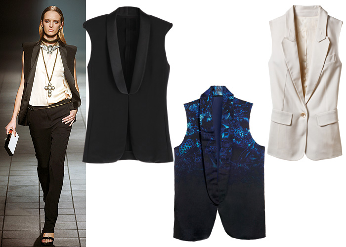 Na imagem acima, da esquerda para a direita: o colete da Lanvin (R$ 4.95) dentro e fora da passarela; estampado da Ellus (R$ 760); e branco com bolsos (R$ 1.960), da Daslu.