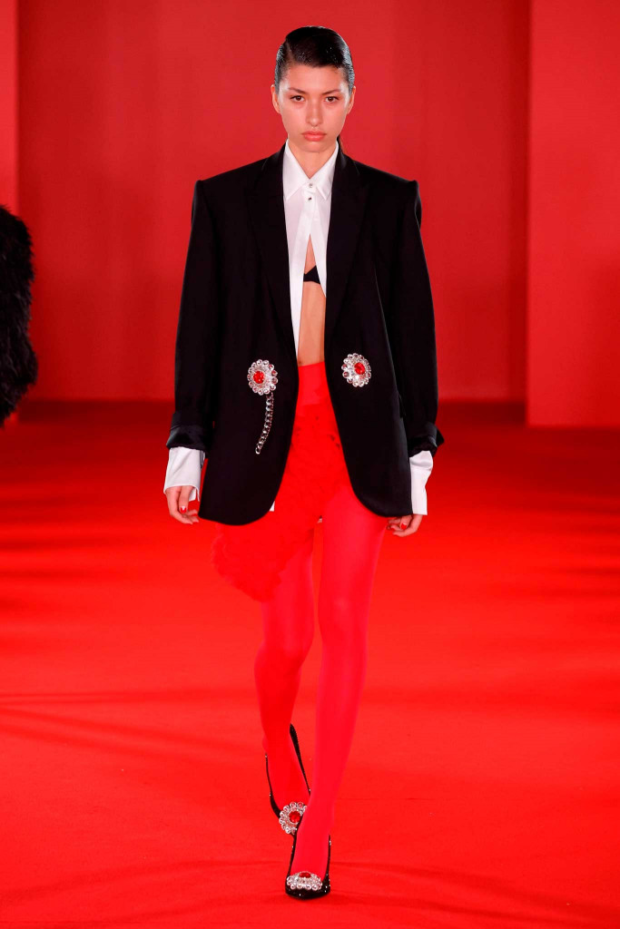 A maioria dos looks foi bordada com flores de couro cortadas à mão embebidas em esmalte vermelho, que Koma disse usar para representar uma feminilidade provocante.