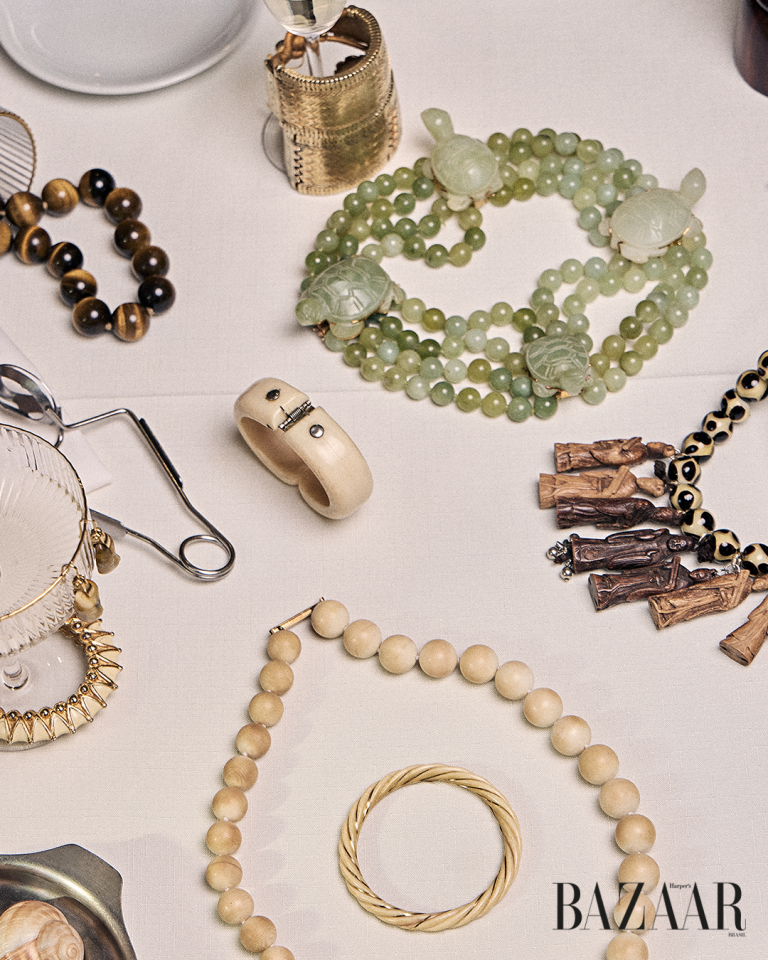 Madeira, jade e metais preciosos compõem a vasta coleção atípica de Marisa Biondo Paschoal. Tudo são achados de viagens inusitadas pelo mundo afora – Foto: Cassia Tabatini, com beleza por Rosa Carlos, direção de arte de Ingryd Gomes, retoque RZ Studio, coordenação Mariana Simon, produção executiva Zuba Hub, produtora responsável Claudia Nunes, assistentes de foto: Gianfranco Vacani e Victor Cohen
