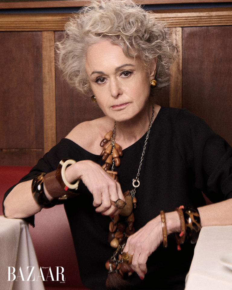 “Você acha que eu estou anormal?”, pergunta, antes de responder a si mesma: “Acho que estou completamente dentro do contexto.” Sobre a saia (de couro verde envernizado), também tem considerações importantes, que faz com uma piscadela – “eu mostro minhas pernas porque sei que são bonitas. Já os braços, não mostro por nada. É bom senso, sabe? Quer um café?”.