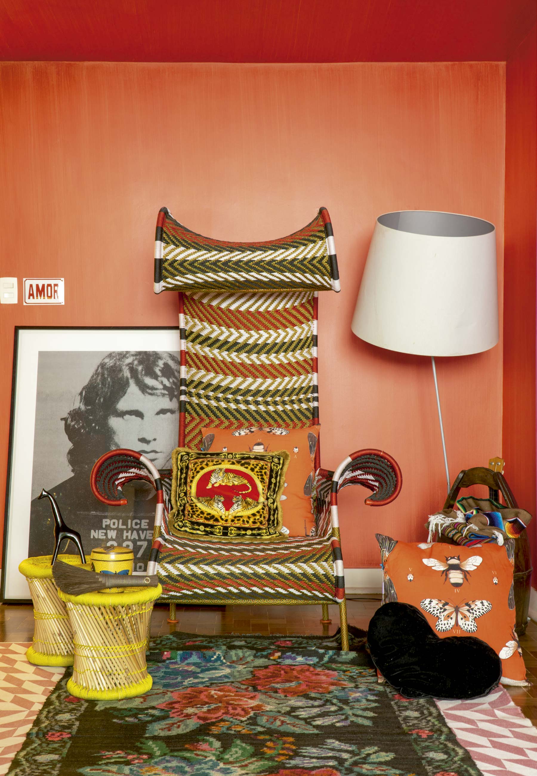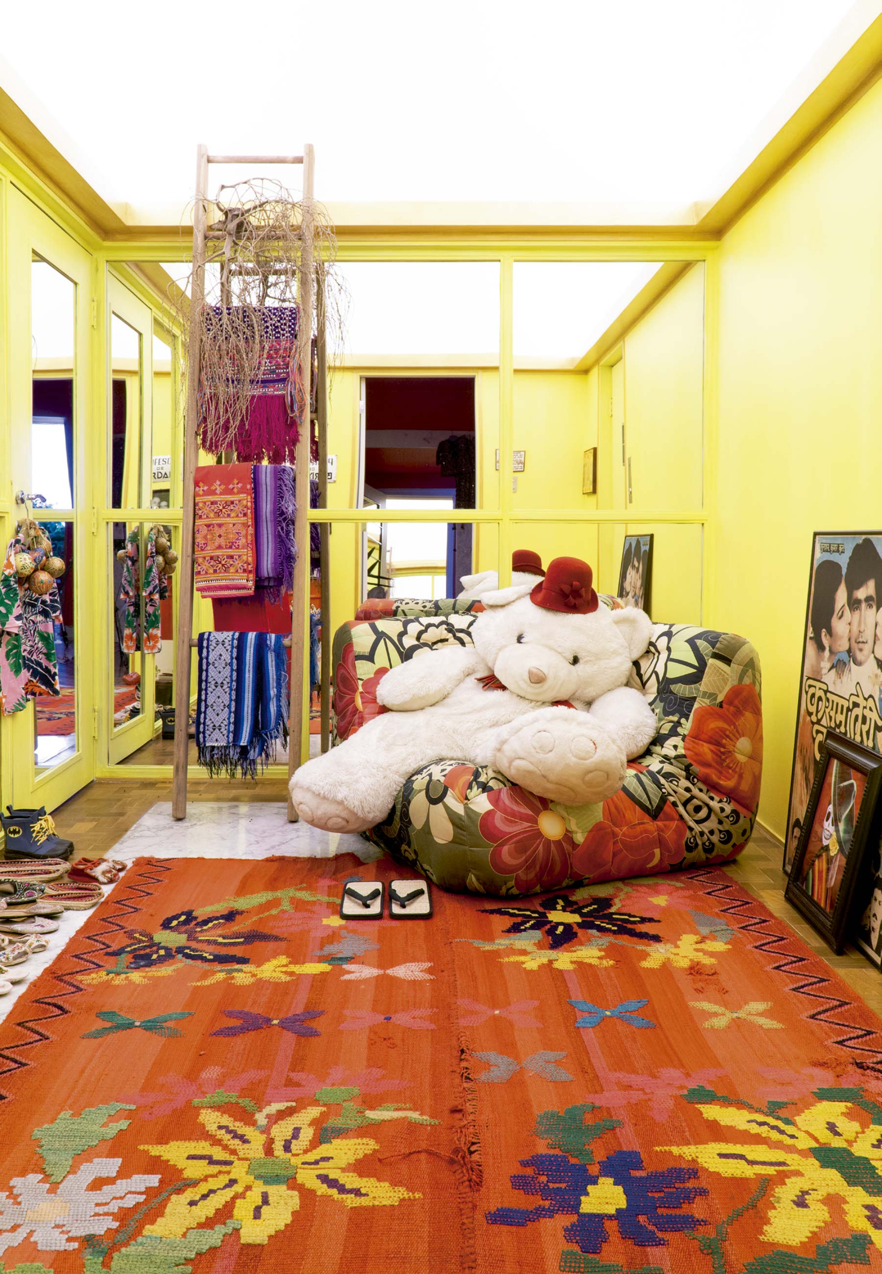 Tapete comprado em Buenos Aires, sofá revestido com tecido de sua marca homônima, urso de pelúcia de sua infância e escada com tecidos garimpados pelo mundo – Foto: Christian Maldonado