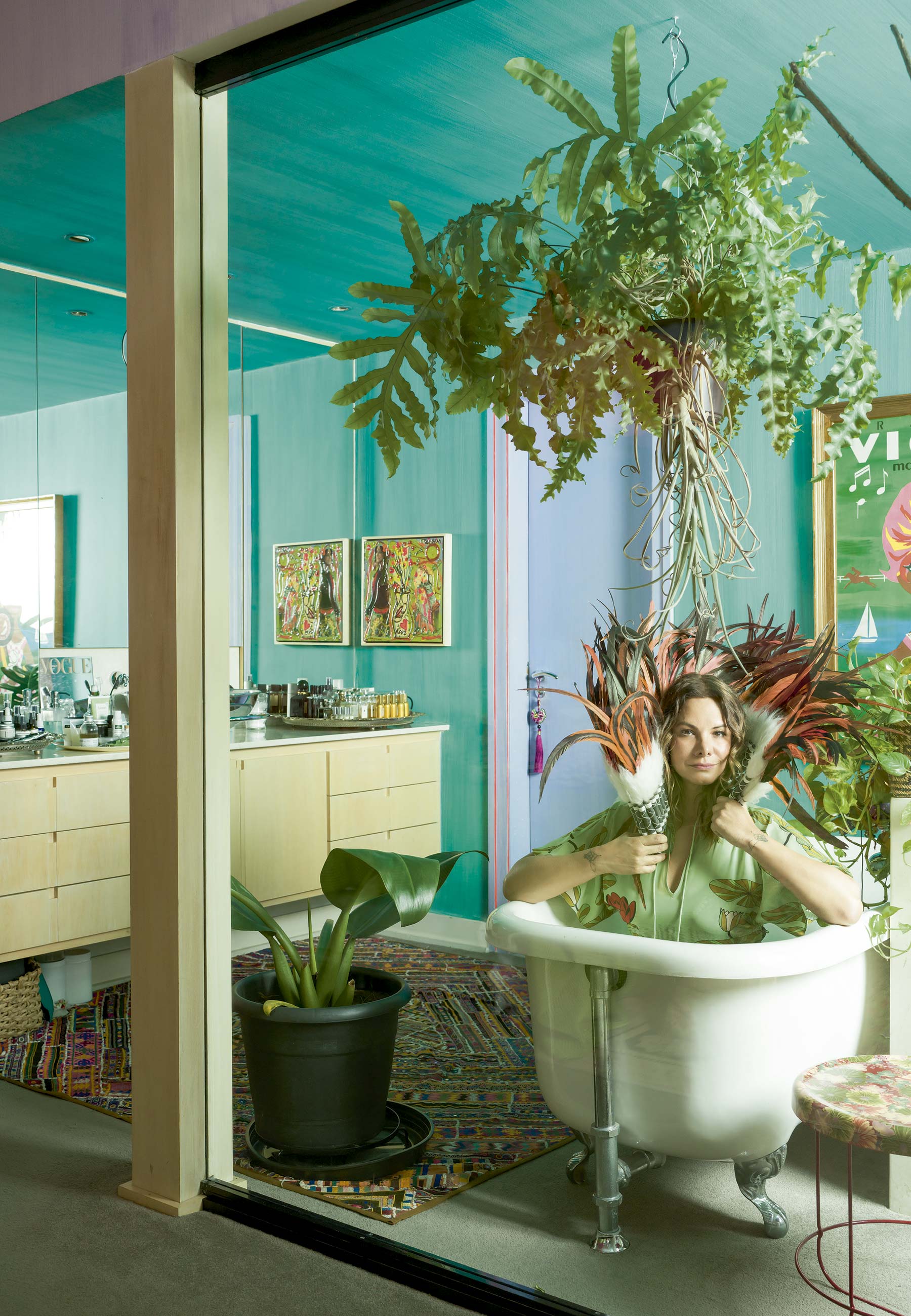 Adriana segura cocar indígena comprado em Alto Paraíso, em Goiás; tapete comprado na Índia; pintura de Isabelle Tuchband; e mesinha de Tomita Kazuhiko para Moroso – Foto: Christian Maldonado
