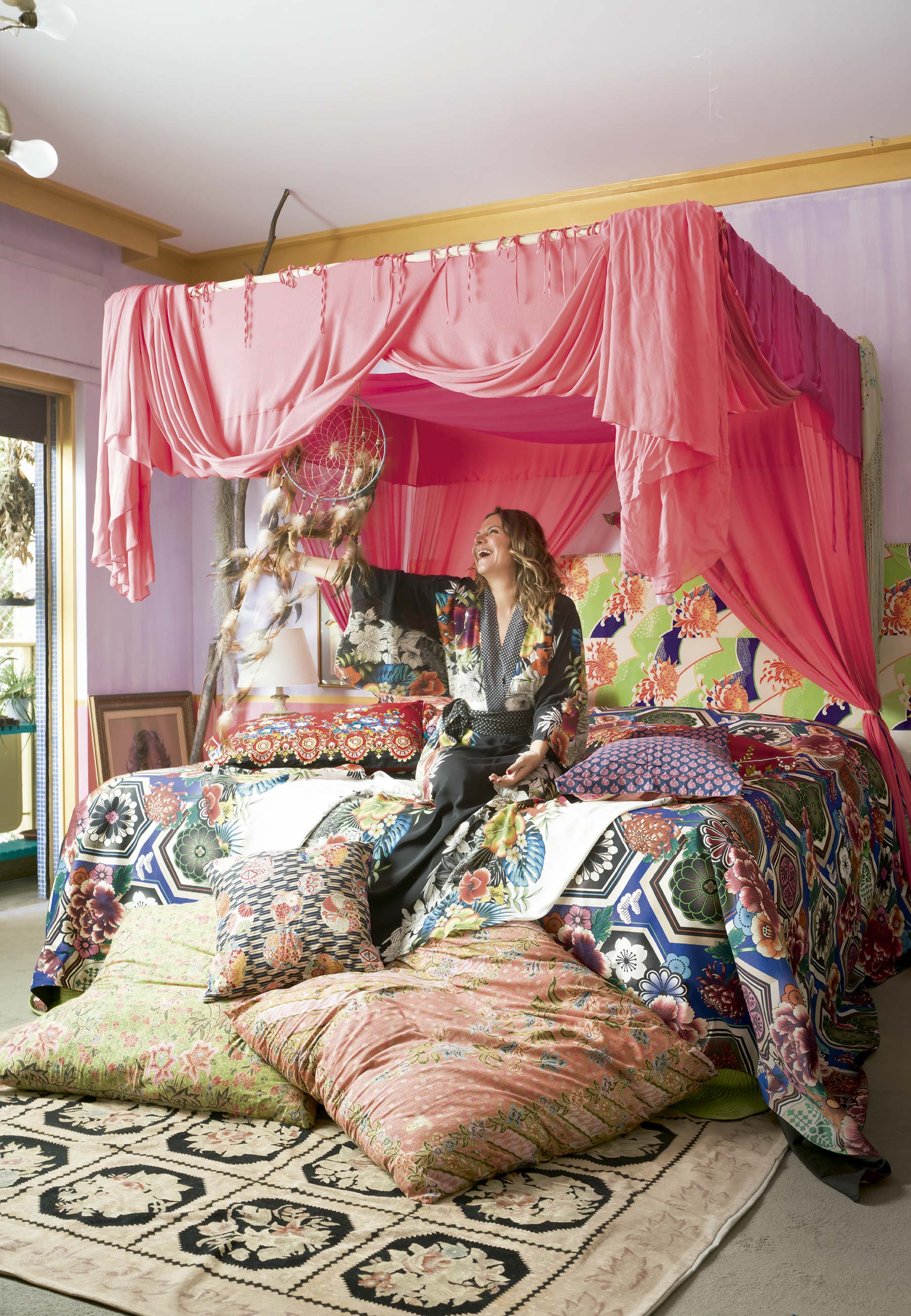 Adriana em sua cama, com cabeceira feita de quimono japonês dos anos 1950, dossel criado pela amiga Karin Farah, almofadas de tecidos de sua marca e comprados em viagens, colcha de sua marca homônima e filtro de sonhos comprado em Sedona – Foto: Christian Maldonado