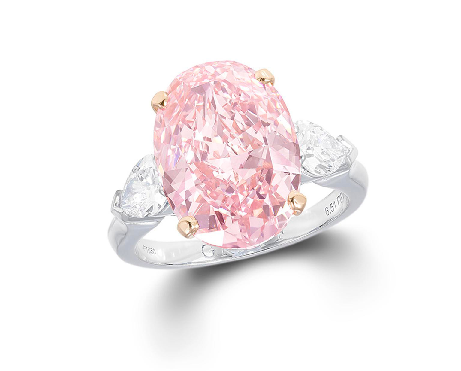 Anéis com pedras cor-de-rosa trazem muita delicadeza, e esse não é diferente. O Graff Pink é um anel de diamante rosa de 24,78 quilates, com uma das mais lindas pedras existentes, sendo retangular com os cantos arredondados. Por pertencer ao joalheiro de luxo Harry Winston, seu valor foi avaliado em US$ 28 milhões (R$ 107 milhões), mas quando leiloado foi para US$ 46 milhões (R$ 176,5 milhões).