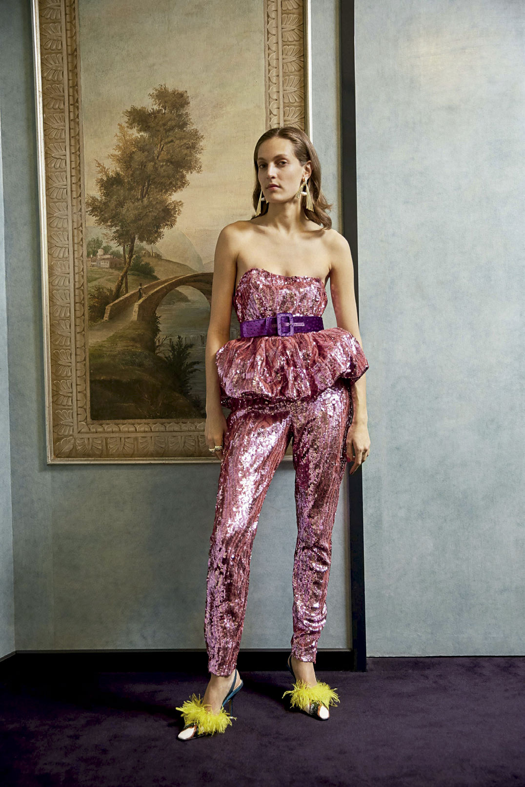 Na lista de criações há também bolsas feitas com paetês ou plumas, mules de cetim e acessórios marcantes, como as caneleiras com fivelas nas versões clean ou cobertas por glitter.