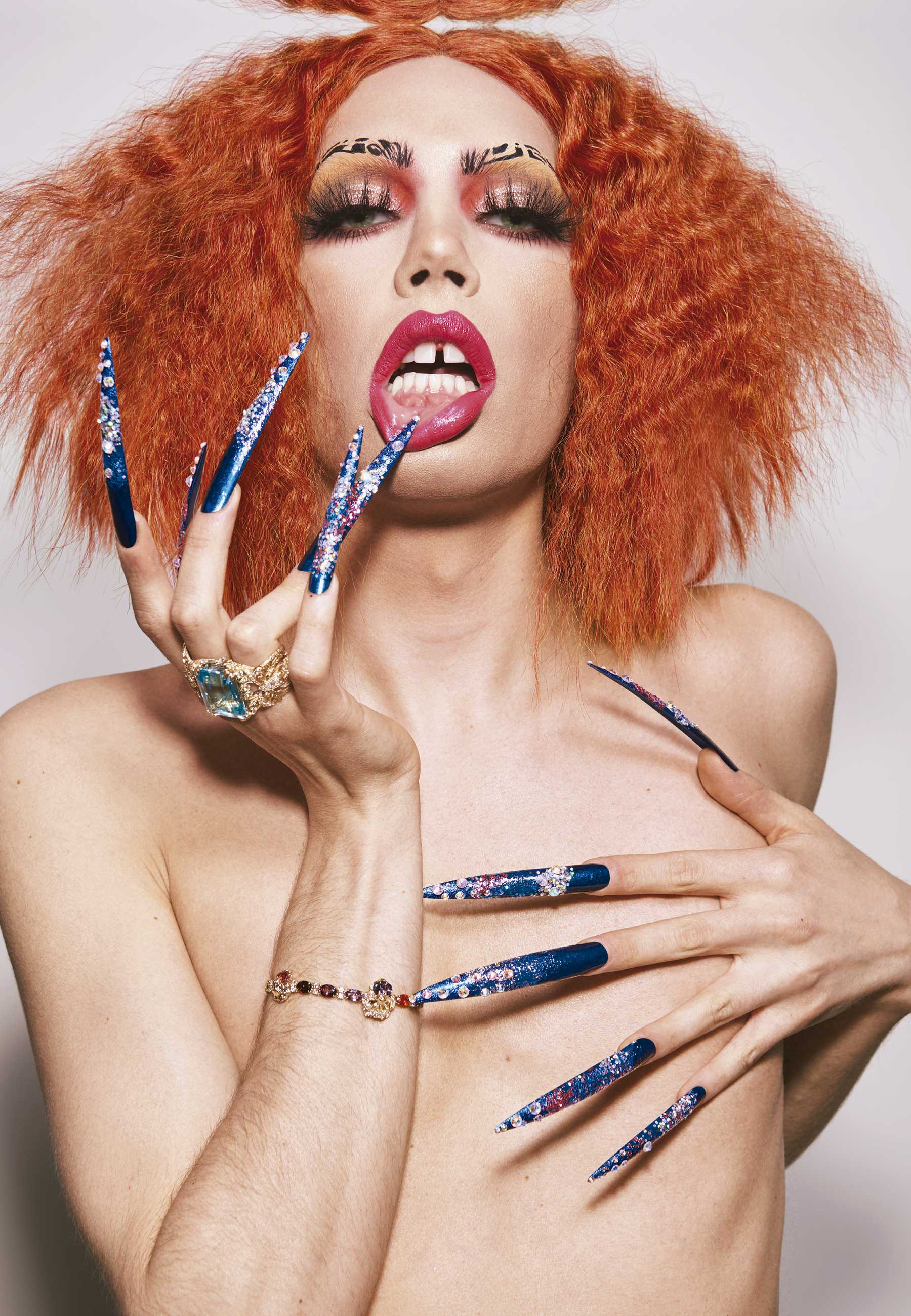 Ola Kursa (MP Management Milano) veste look Gucci. Lilly Love usa brincos em ouro branco, opalas verde-azuladas, espinelas vermelhas e diamantes; colar com pingente em ouro branco, turmalinas rosas, berilos amarelos e diamantes; pulseira em ouro branco, espinelas, tsavoritas e diamantes; e anel em ouro branco, rubis e diamantes, tudo Gucci High Jewelry.