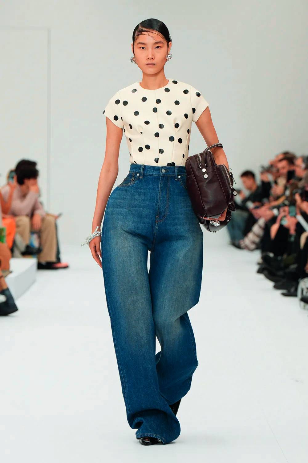 Stella McCartney, Vivetta, Anthropologie, The Kooples, Fendi, Valentino, Chanel. As opções são extensas e não se limitam a uma única proporção, afinal, essa democracia no vestir é fundamental. No mundo ‘real’, o jeans com essa bossa deu as caras e foi parar no corpo do rapper Kendrick Lamar, estrela do Super Bowl 2025, um dos eventos esportivos mais televisionados e lucrativos do mundo. Com styling de Taylor McNeill, Lamar usou um jeans Celine bootcut (o estilo Y2K está de volta, veja bem), bem como uma jaqueta universitária de couro da marca Martine Rose personalizada que dizia “GLORIA” na frente.