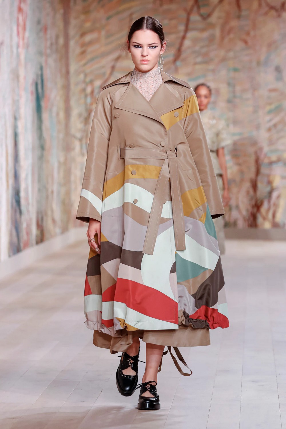 O trench coat estampado e amplo foi um dos destaques do desfile.