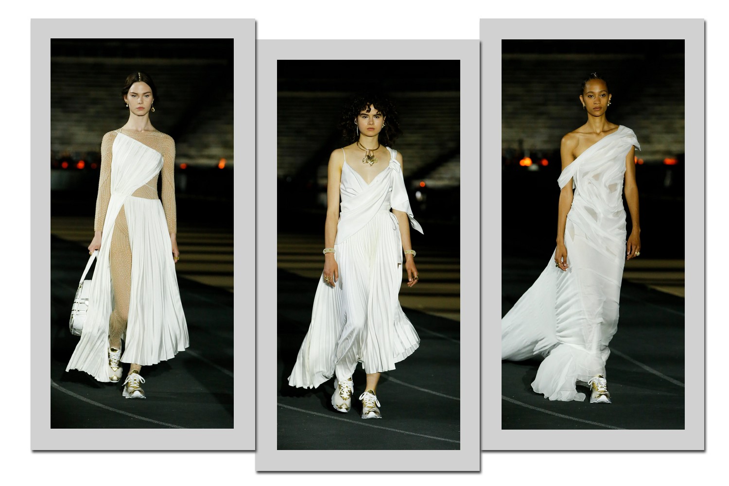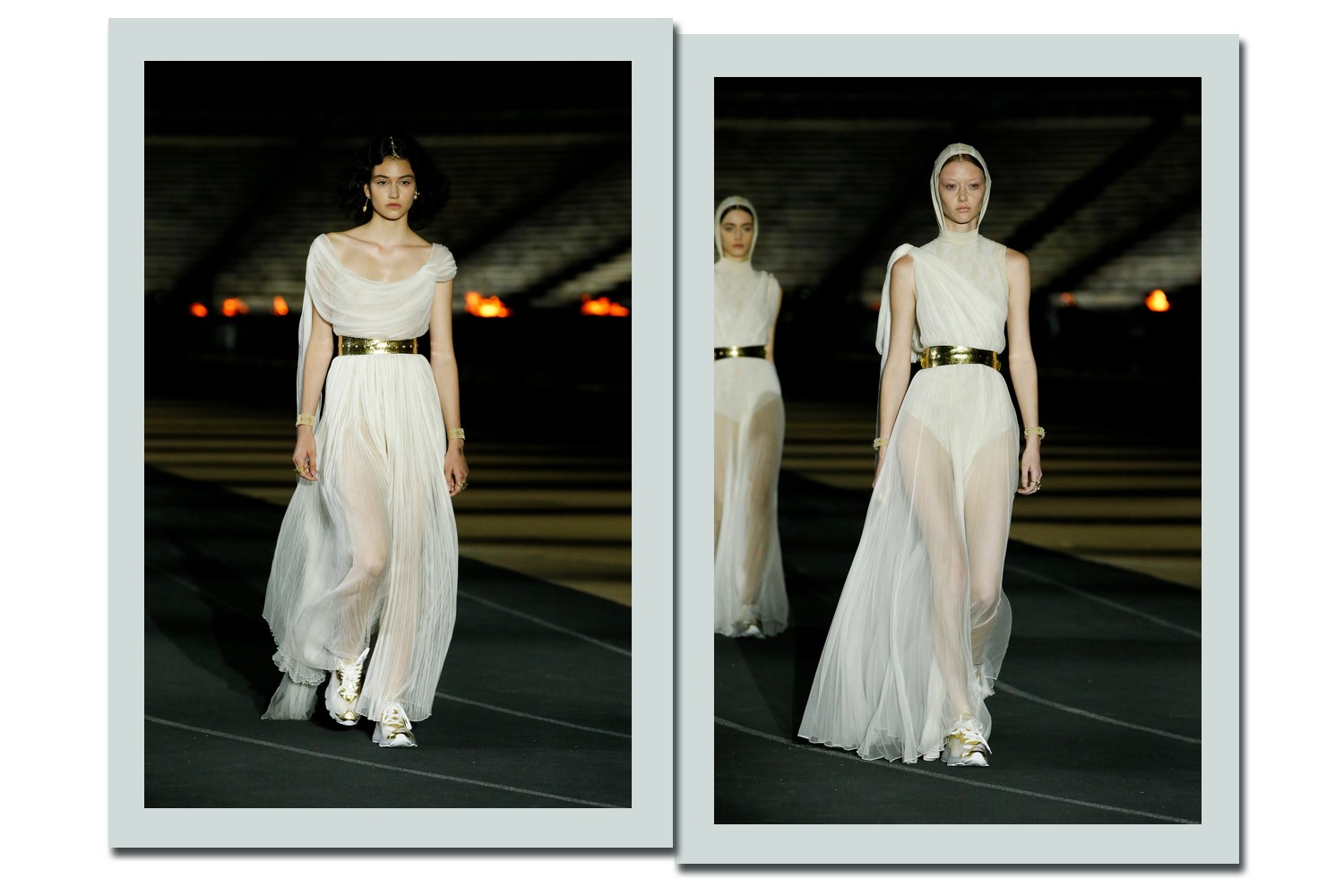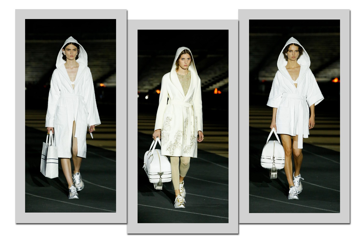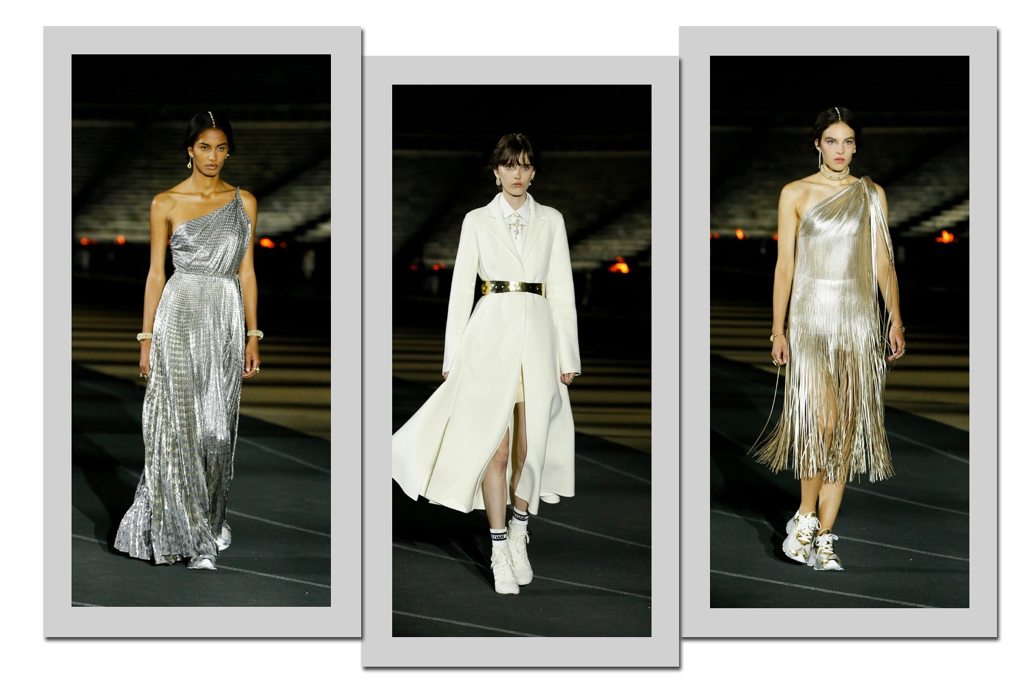 Um casamento perfeito conceitualmente, que se traduz de cara na junção da silhueta lânguida, feminina e colunesca aos arrojados tênis de corrida e no uso de materiais hipertecnológicos. Ao som de Ioanna Gika, o canto entoado pelo grandioso Panatheniac Stadium na companhia da Greek Orchestra ganha uma queima de fogos emocionante ao fim do desfile, que tem como último look uma homenagem ao look usado por Marlene Dietrich, em 1935, quando a atriz vestiu-se como a deusa grega Leda – visual que mais tarde foi reproduzido e imortalizado pela cantora Jörk.