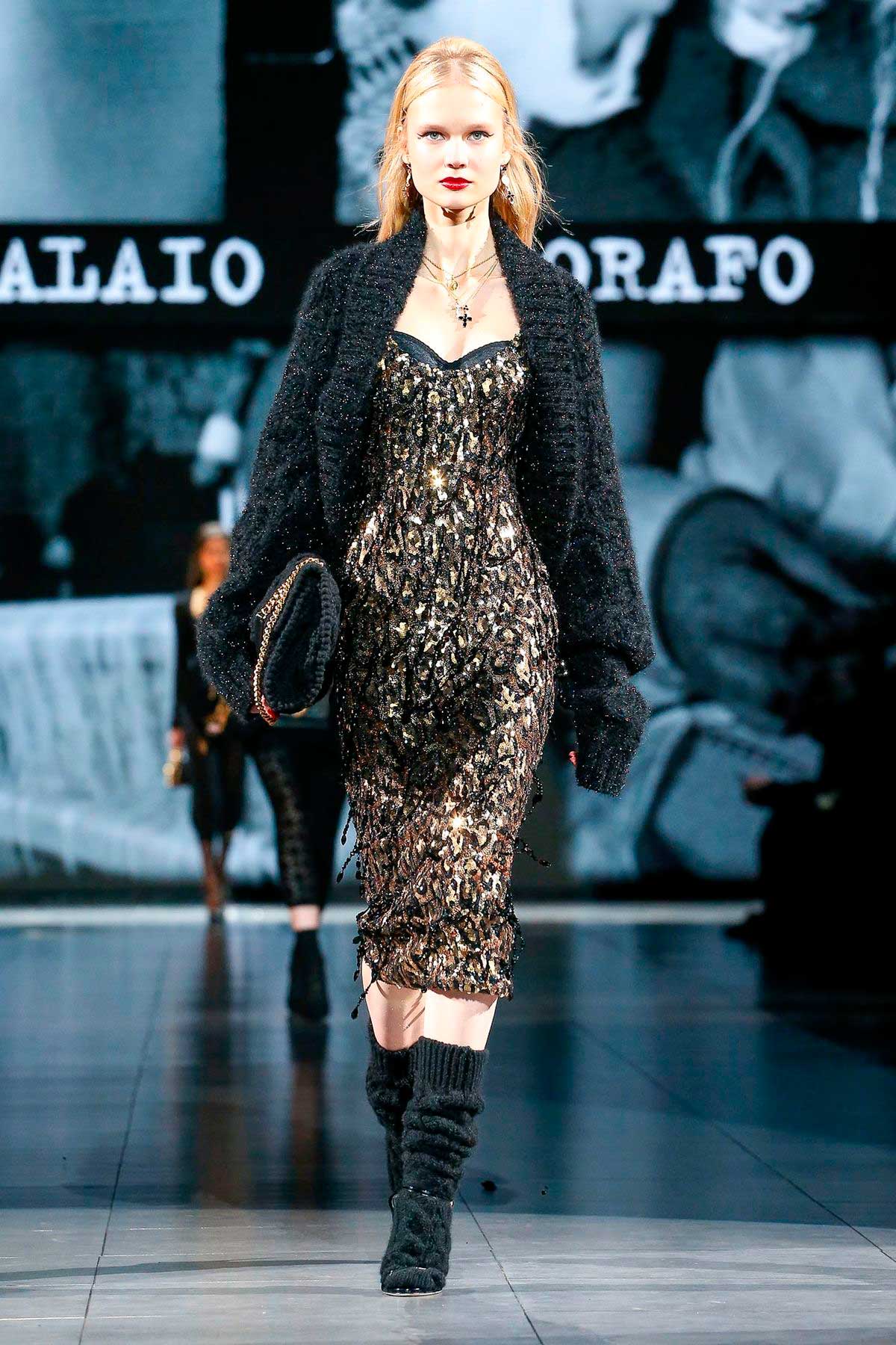 Referências explícitas aos anos 1970, como por exemplo os looks que combinam microshorts a maxicasacos desfilam ao lado de looks grunge. A versão do estilo, que caracterizou os anos 1990, no inverno da Dolce é fácil e superdesejável, vide slip dresses bordados, ou franjados com pedrarias usados sob cardigãs, mais meias 3/4 de cashmere e sandálias de festa.