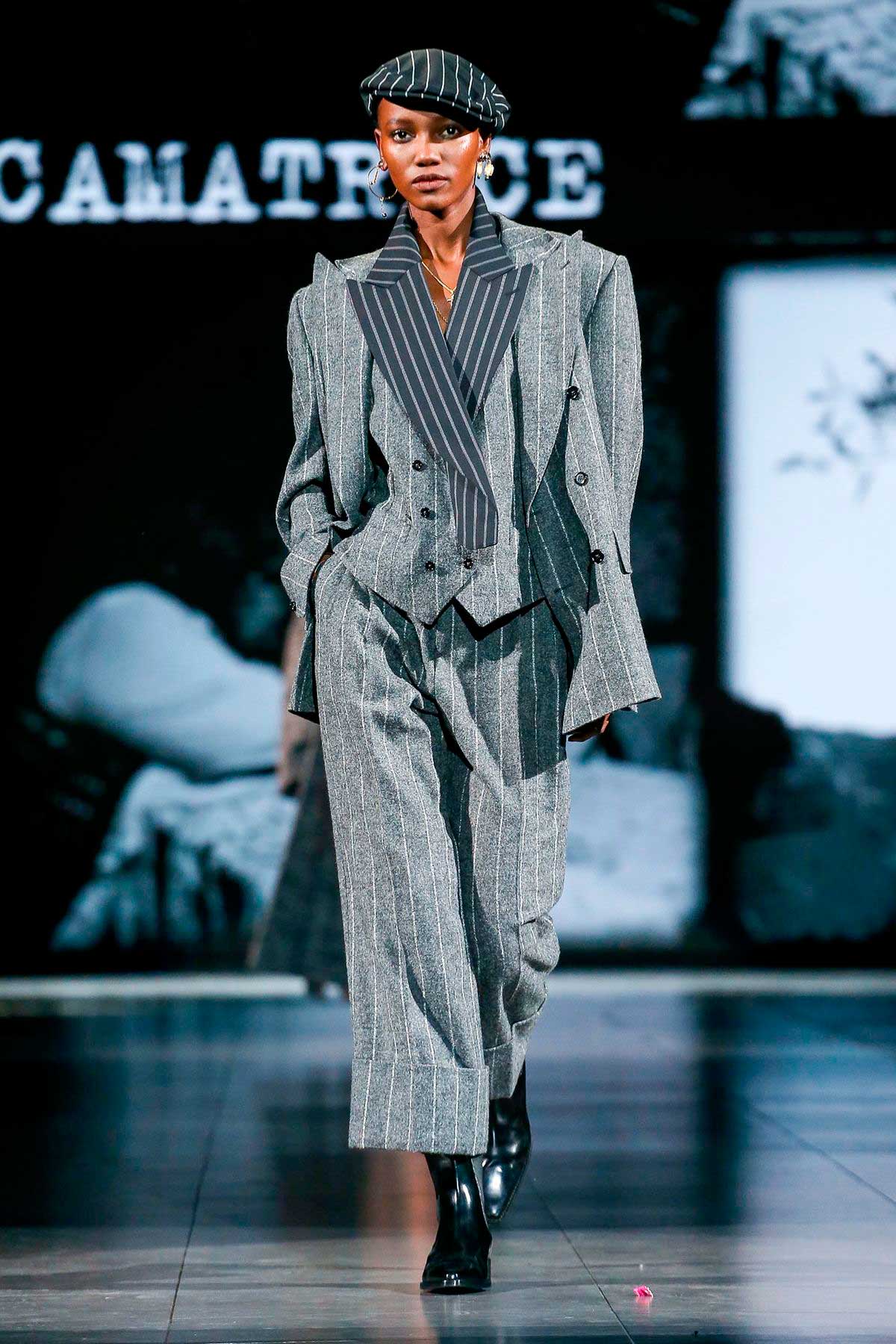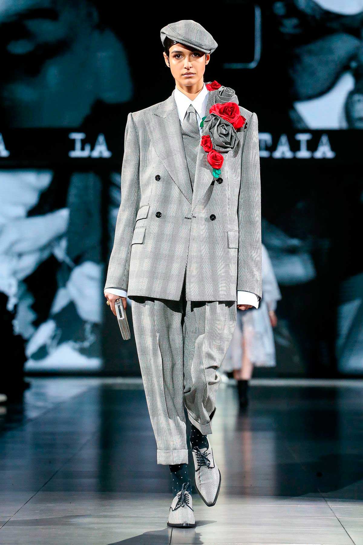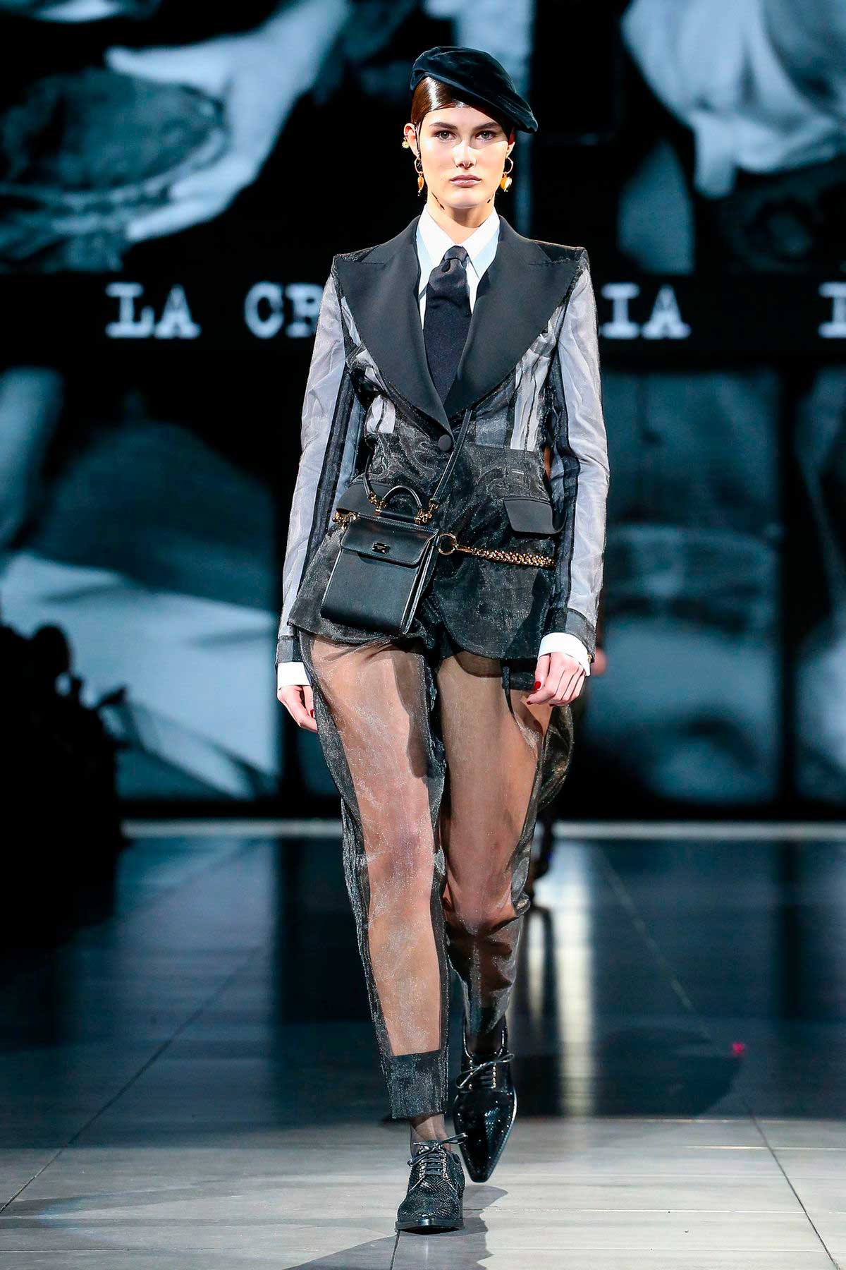 Ternos impecáveis em príncipe-de-gales, bem mafiosos, surgem entre roupas corsetadas e transparentes. A cartela de cores é sóbria e predomina o preto, branco e cinzas, mais pontuais pinceladas vermelhas.