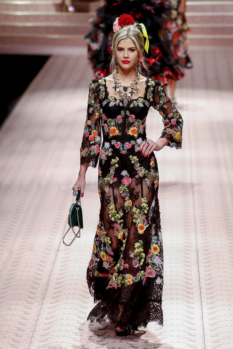 Empresária e influencer brasileira, Lala Rudge, que tem 1,6 milhão de seguidores no Instagram, mostra seu vestido floral da Dolce na passarela.