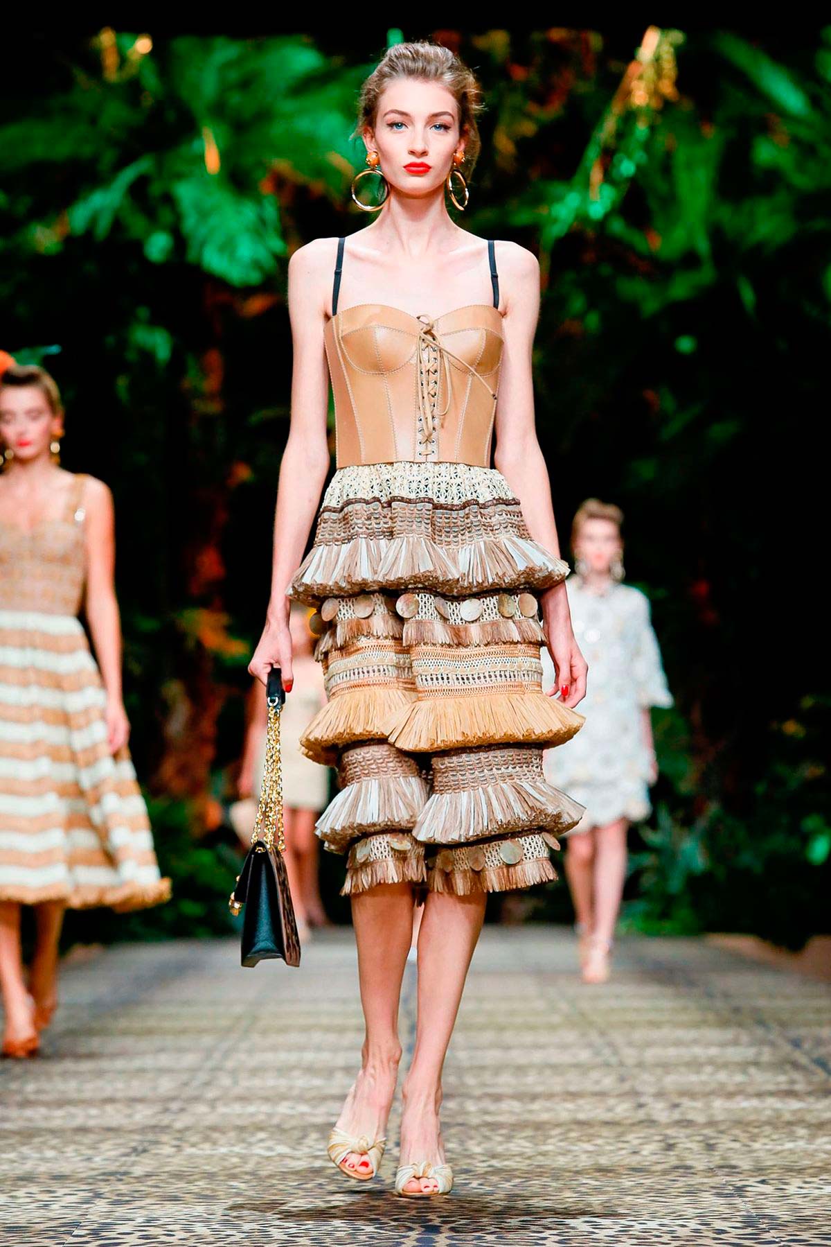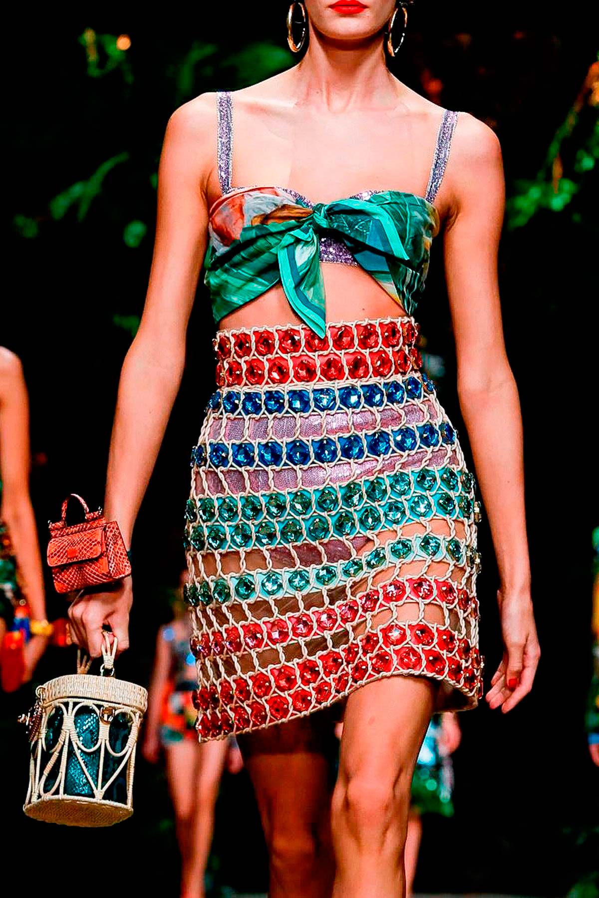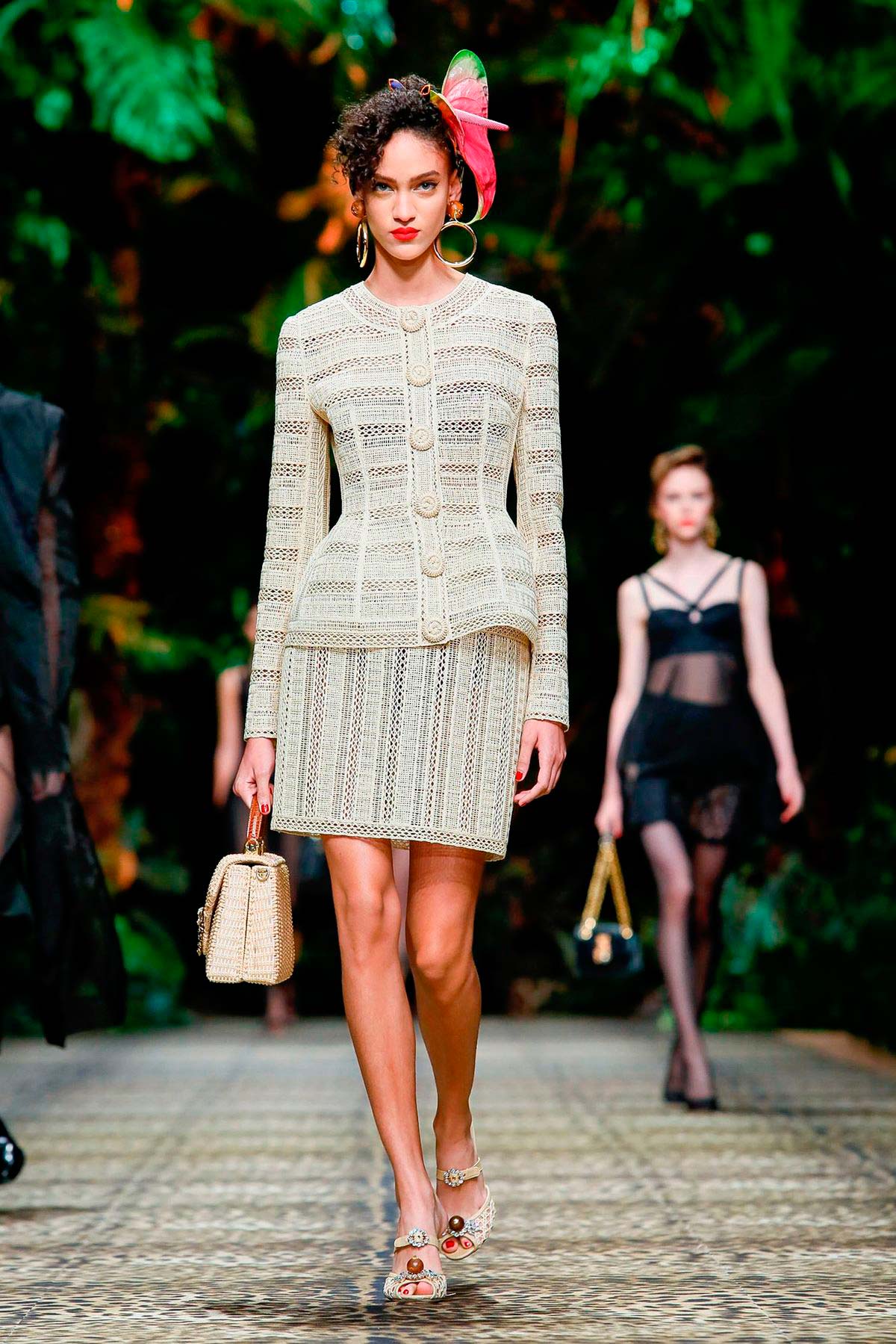 Foi a deixa para entrarem na passarela uma saia com franjas e um tailleur de ráfia. O retorno positivo dessas peças abriu espaço para um bloco inteiro dedicado a materiais naturais na coleção desfilada em setembro de 2019, em Milão. “Combinamos cores vivas e padrões tropicais com artesanato típico da ilha e materiais especiais, como ráfia e vime”, explica a dupla, referindo-se à clássica cestaria feita à mão na Sicília. “A Itália é rica em tradições artesanais que mudam de cidade para cidade, de vila para vila. Nosso país é uma fonte inesgotável de inspiração e habilidade artesanal que deve ser mantida viva”, acentua Domenico.
