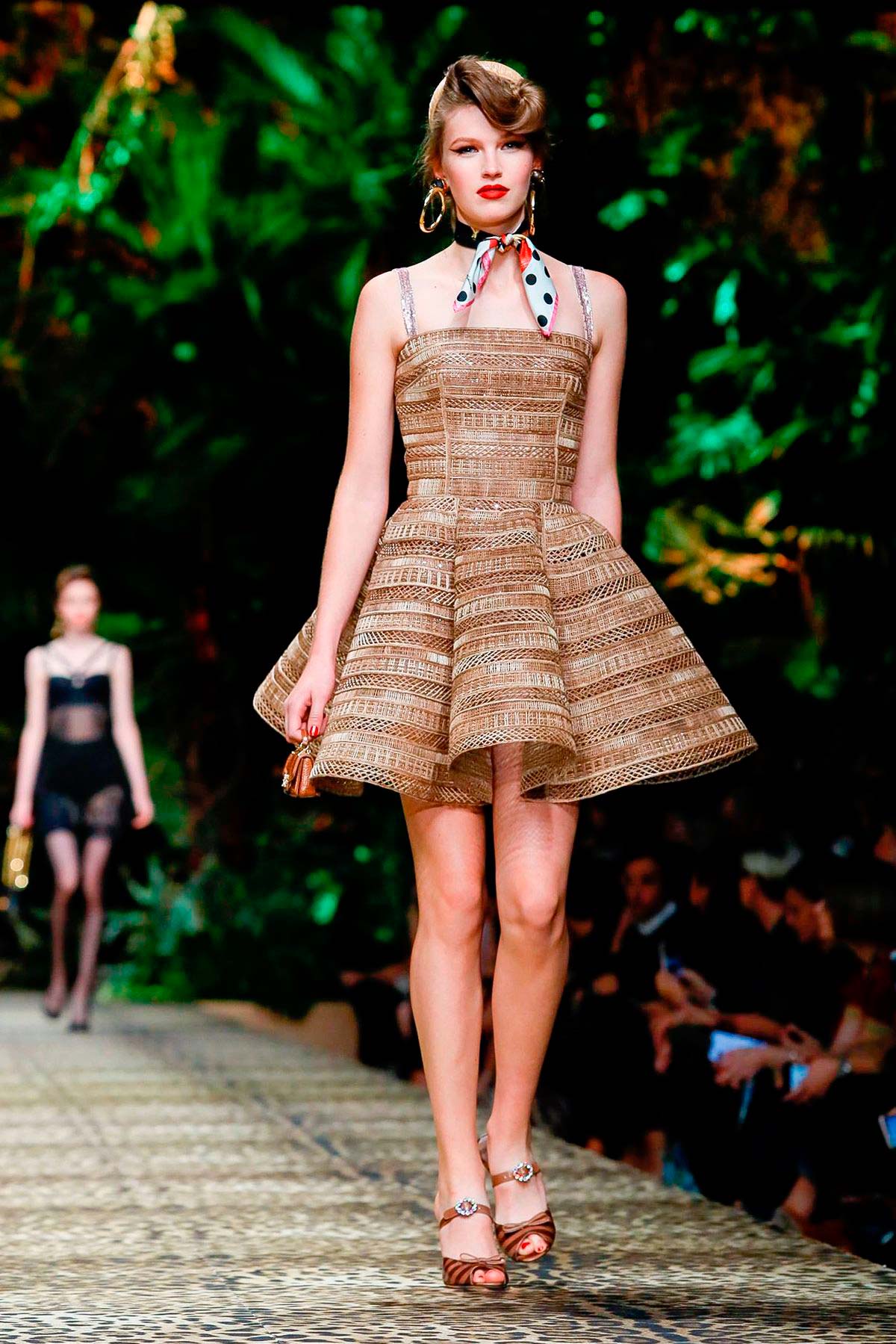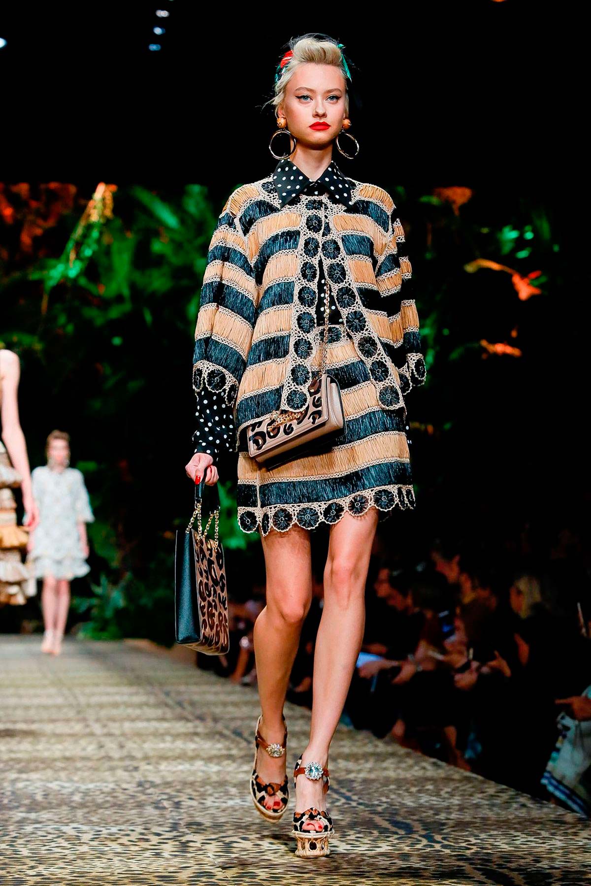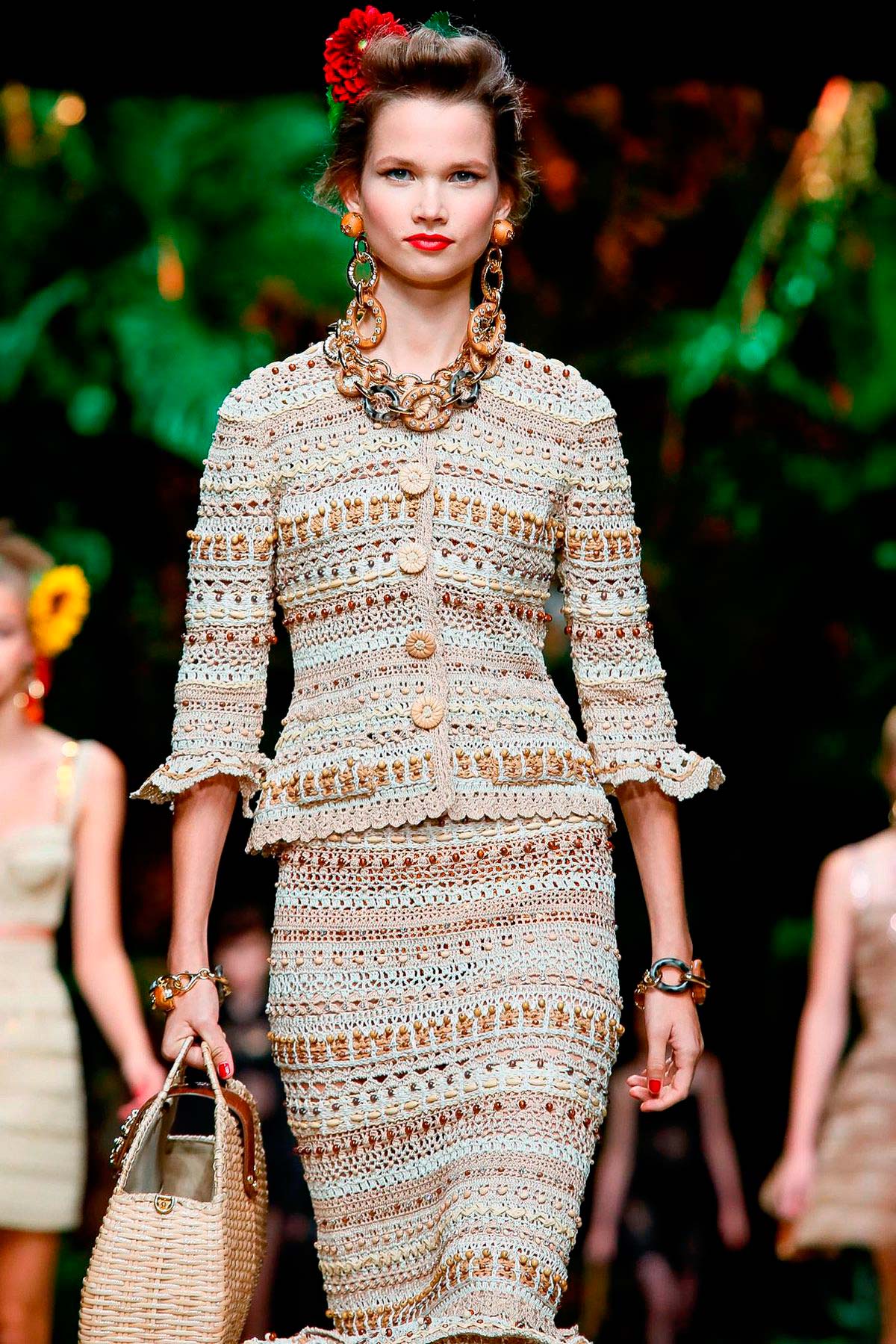 Foi a deixa para entrarem na passarela uma saia com franjas e um tailleur de ráfia. O retorno positivo dessas peças abriu espaço para um bloco inteiro dedicado a materiais naturais na coleção desfilada em setembro de 2019, em Milão. “Combinamos cores vivas e padrões tropicais com artesanato típico da ilha e materiais especiais, como ráfia e vime”, explica a dupla, referindo-se à clássica cestaria feita à mão na Sicília. “A Itália é rica em tradições artesanais que mudam de cidade para cidade, de vila para vila. Nosso país é uma fonte inesgotável de inspiração e habilidade artesanal que deve ser mantida viva”, acentua Domenico.