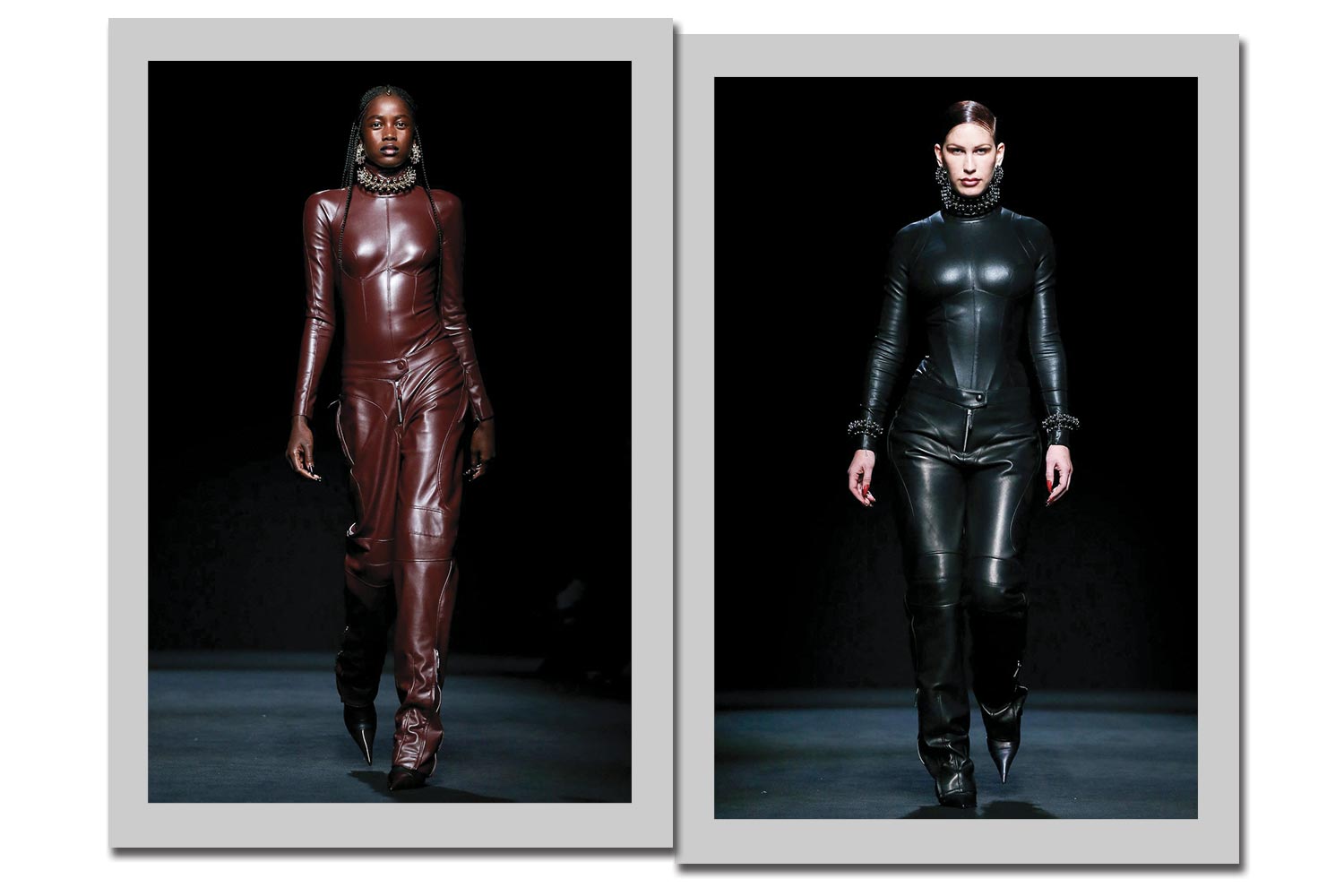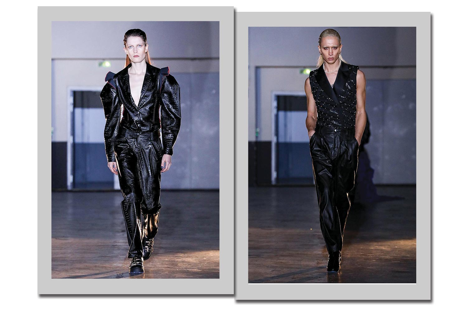 Em looks genderless, a Koché vai de couro, tanto no macacão com ombros bem marcados à esquerda, quanto no conjunto de calça + colete com tachas de metal, à direita.