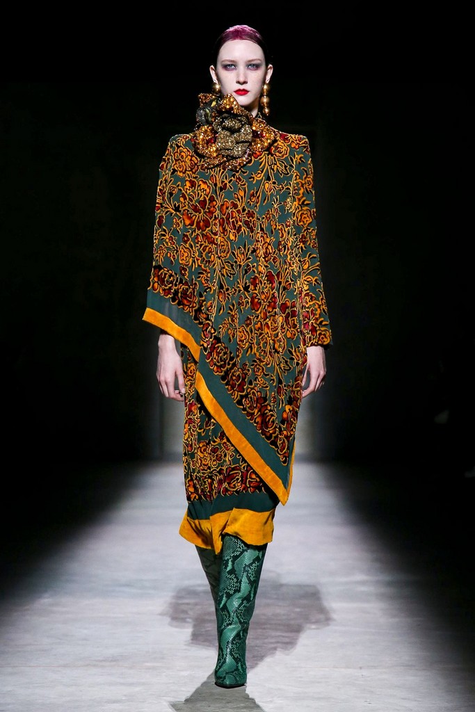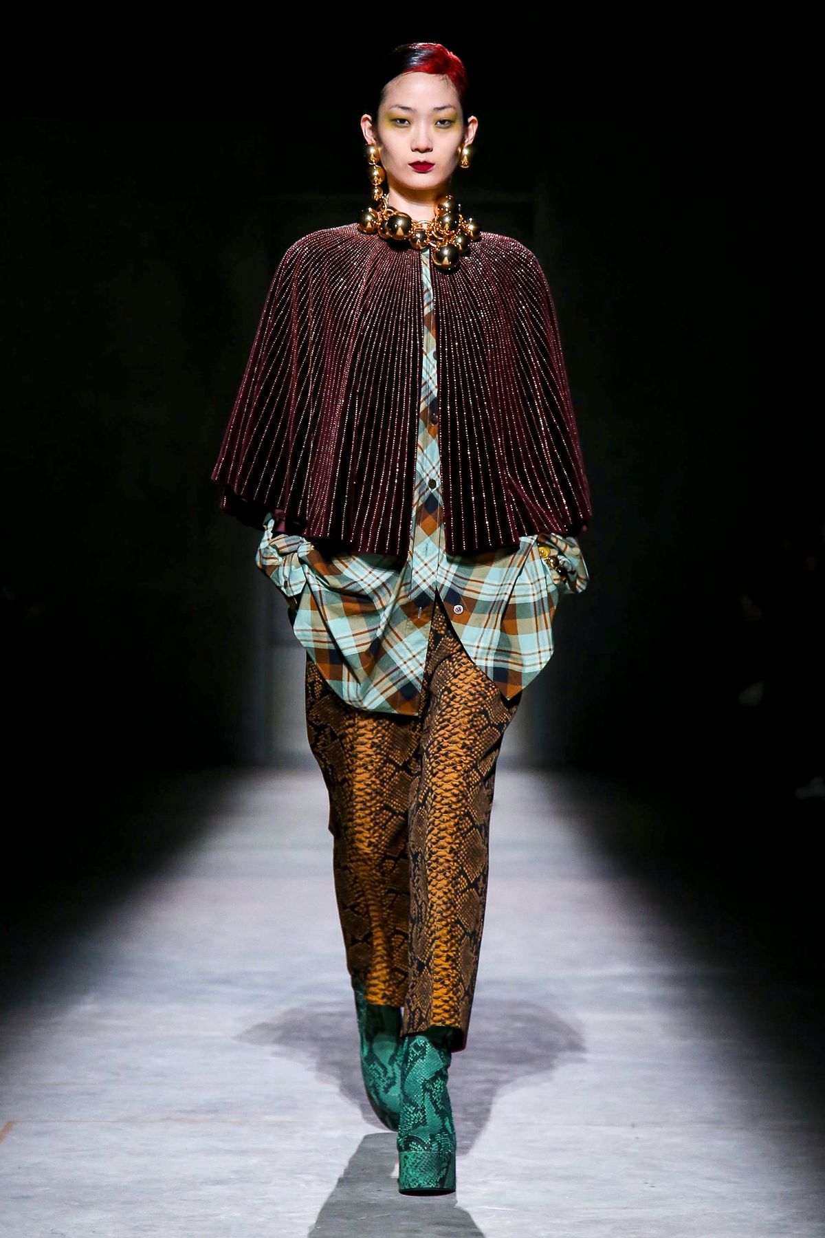 As peças assumem uma silhueta longilínea, com ombros sendo o destaque em vestidos e jaquetas. A Dries Van Noten ainda reafirma tendências que têm despontado na temporada, principalmente as franjas e os maxicasacos. O xadrez e a lã dão um toque grunge à coleção, que foi acompanhada com uma beleza à la Billie Eilish: a raiz do cabelo das modelos foi pintada com tons de verde, azul e vermelho. O mix perfeito entre o excesso e a elegância.