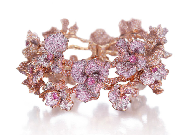 O e-commerce de luxo Swoonery se prepara para vender peças exclusivas da designer Neha Deni. Entre elas, encontramos está o Amarante Bracelet, uma pulseira que contém mais de 75 quilates de diamantes cor-de-rosa naturais e foi avaliada em US$ 3 milhões (cerca de R$ 9 milhões). Inspirada em flores desabrochando em galhos, a peça contém 18 diamantes fancy vived purplish-pink com o total de 4.02 quilates, que representam os pistilos da flor, e mais de 11 mil diamantes rosa menores. No total, são 72.83 quilates que formam as pétalas das flores. Cada diamante tem um certificado individual do Instituto de Gemologia da América, o GIA.