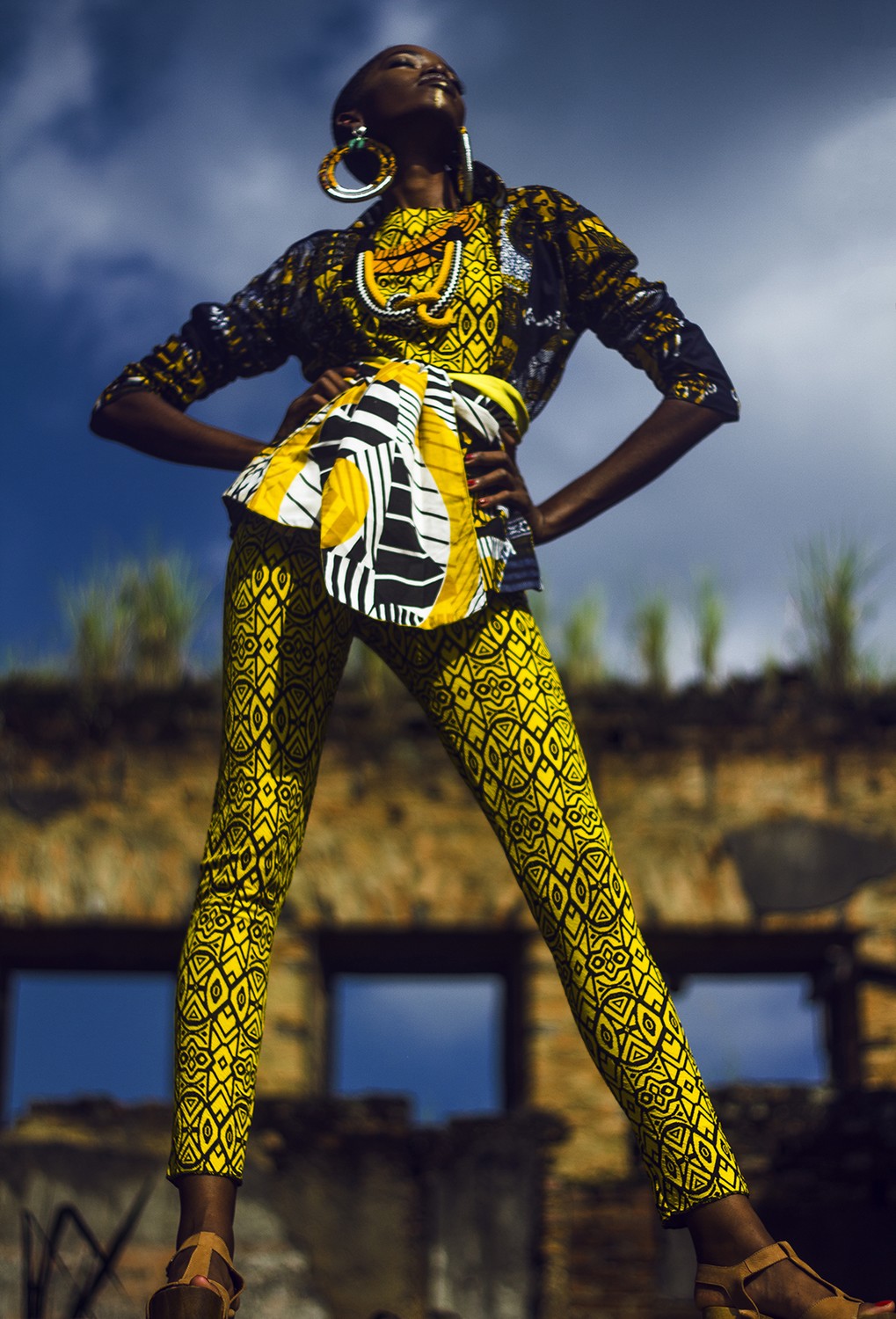 Blazer, cropped e calça Tai Brum, sandália Dress To, faixa Negrita Moda, colar Nega Roots e brinco Quixotesca – Foto: Alllexandros, com edição de moda de Gabriel Alves e Lisa Mamedir e beleza de Miss Emanuelle